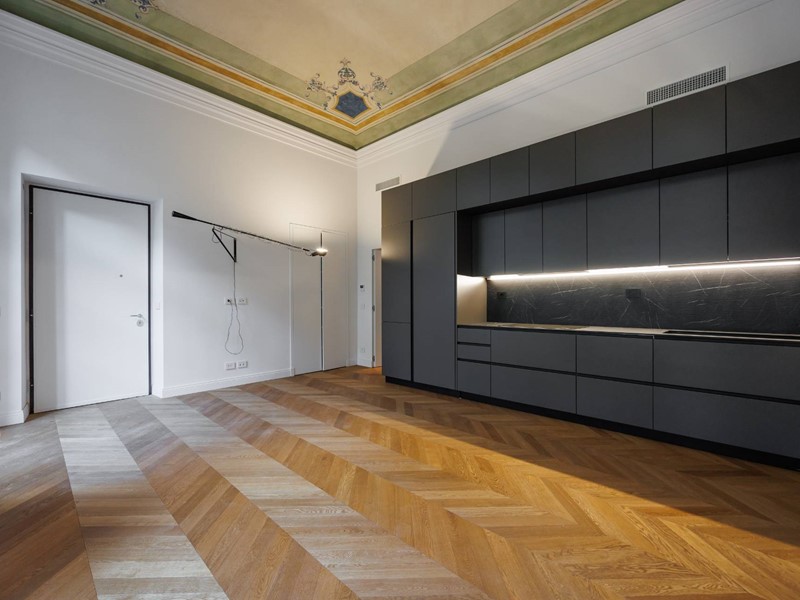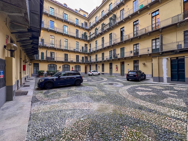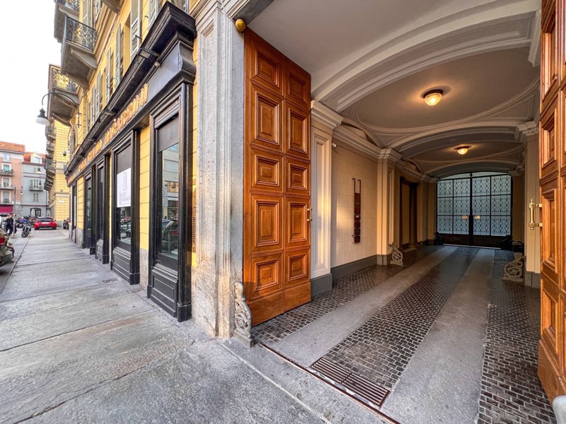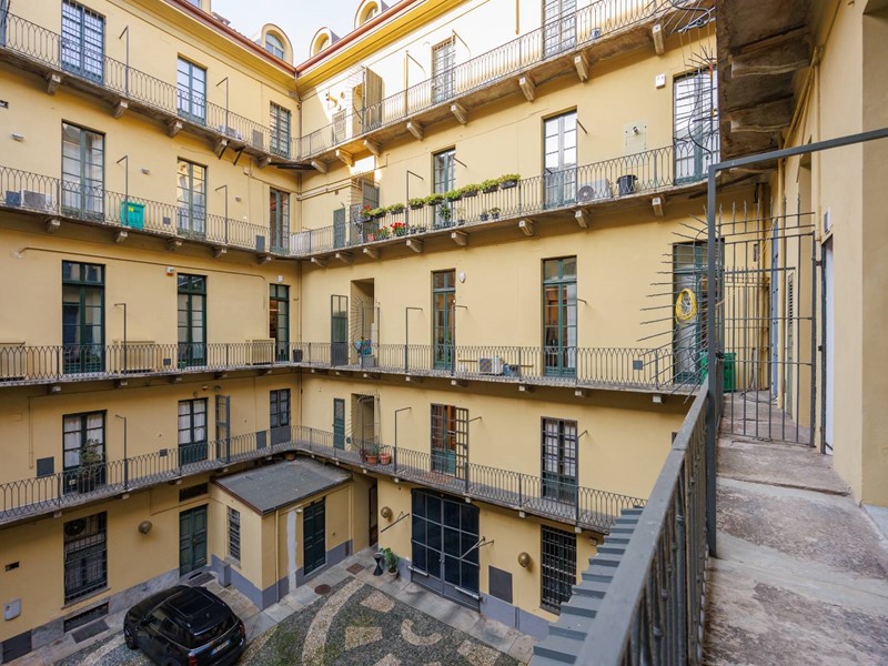 La proprietà è così composta: Ingresso su zona living con cucina a vista e balcone che affaccia sulla corte interna, due camere da letto entrambe con balcone con affaccio su via Lagrange, e due bagni di cui uno en suite. Doppia esposizione. La zona giorno e una camera sono caratterizzate da soffitti affrescati.