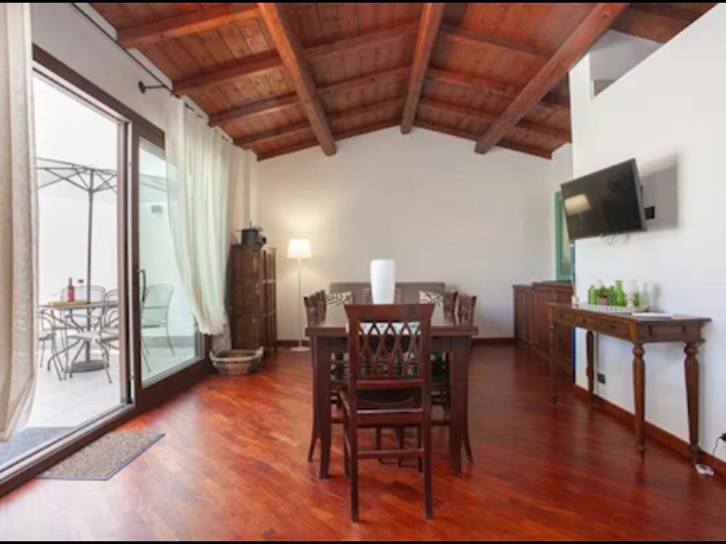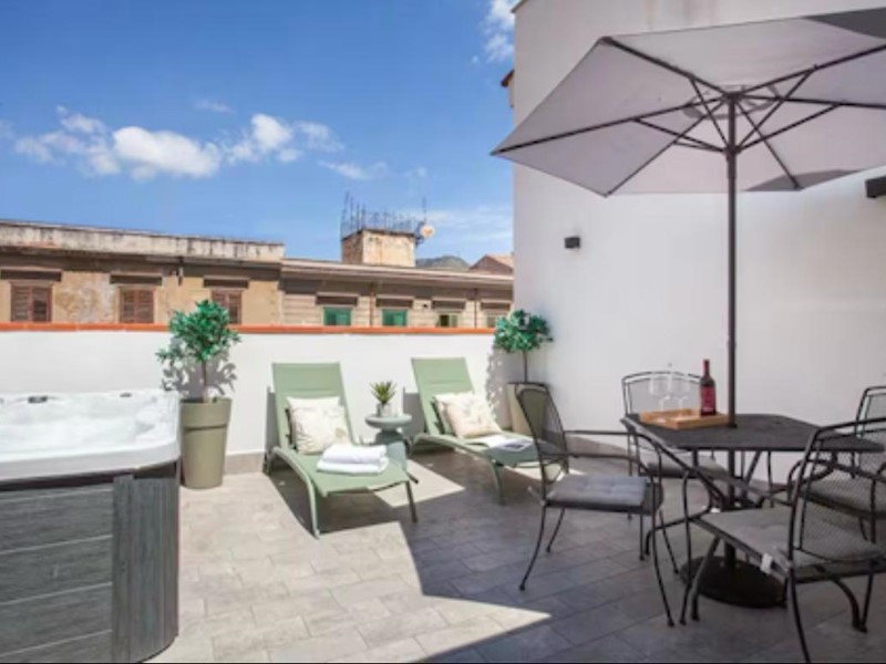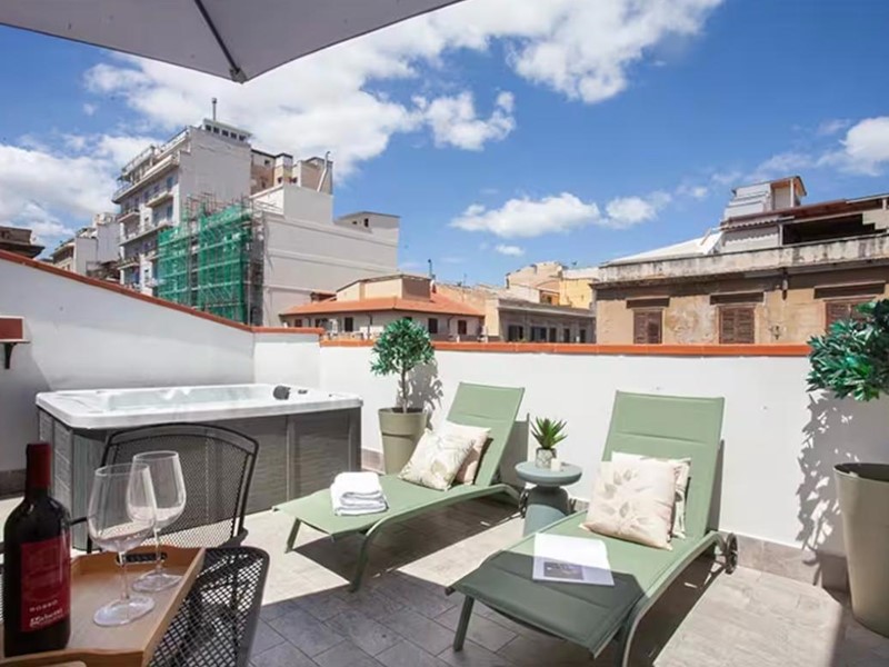 L'appartamento, ristrutturato e parquettato, dispone di due camere da letto, bagno, e cucina-soggiorno con accesso a un terrazzo attrezzato con idromassaggio, punto di forza amatissimo dagli ospiti.
