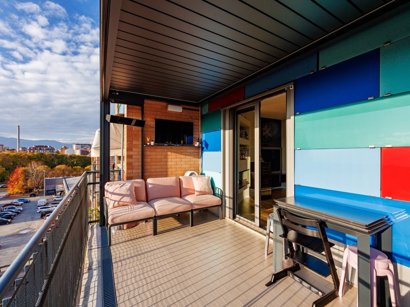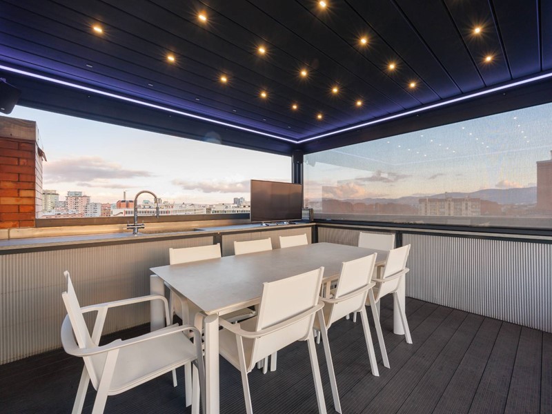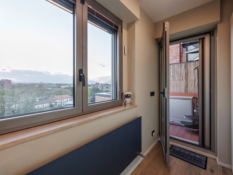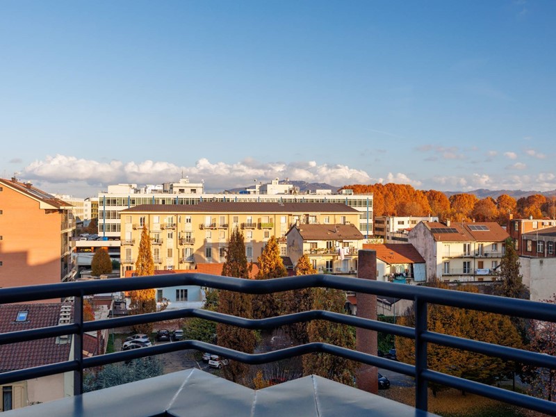 piano 6: ingresso su soggiorno doppio con cucina a vista completa di isola, un terrazzo coperto completo di tende da sole, con tavolo e sedie, la vista è sulla collina e Superga, sul lato opposto un altro grande terrazzo attrezzato con pergola motorizzata elettricamente e vista su arco alpino, una camera matrimoniale e un bagno con doccia;