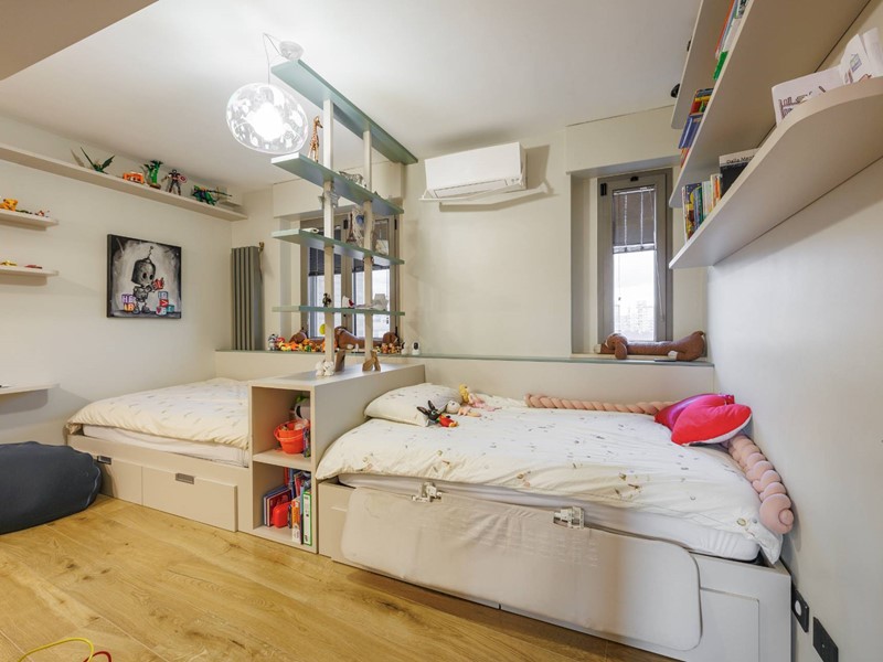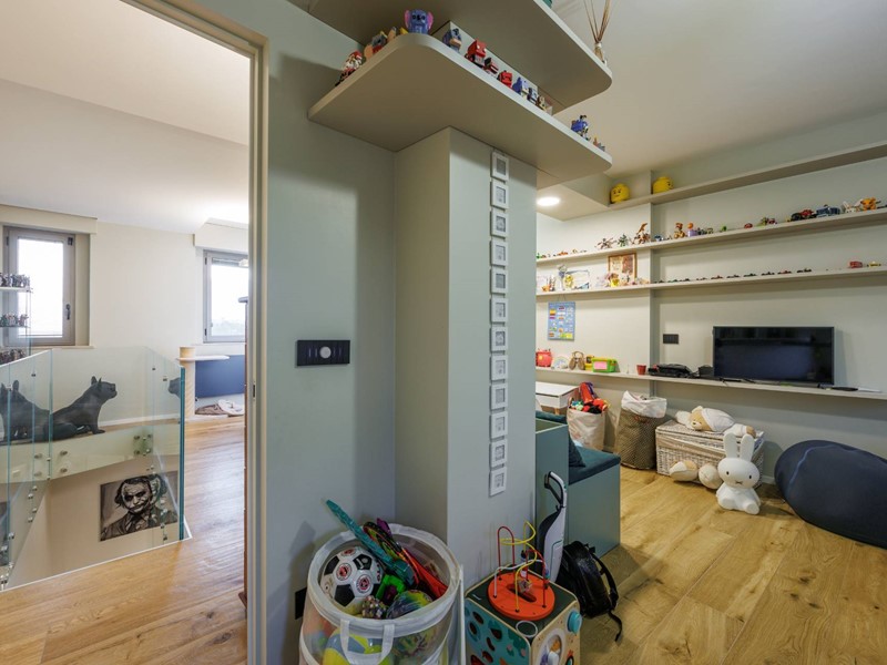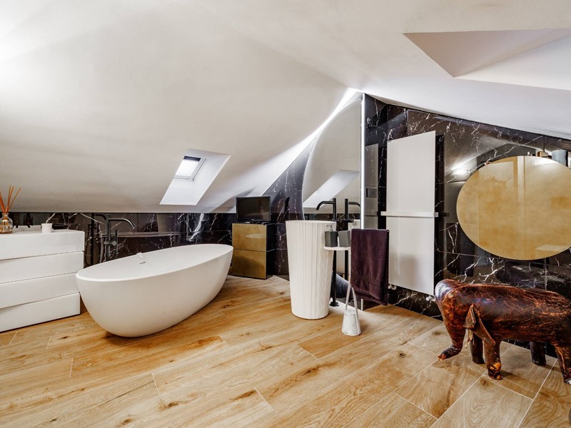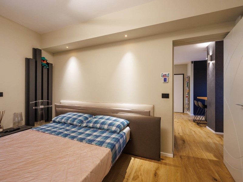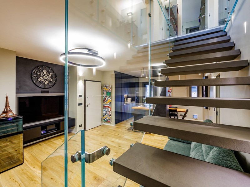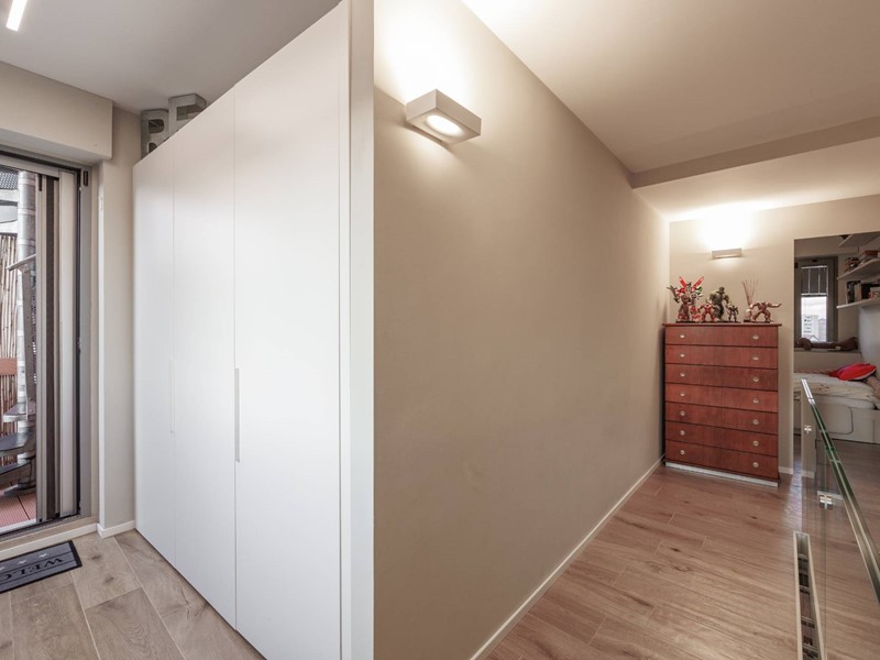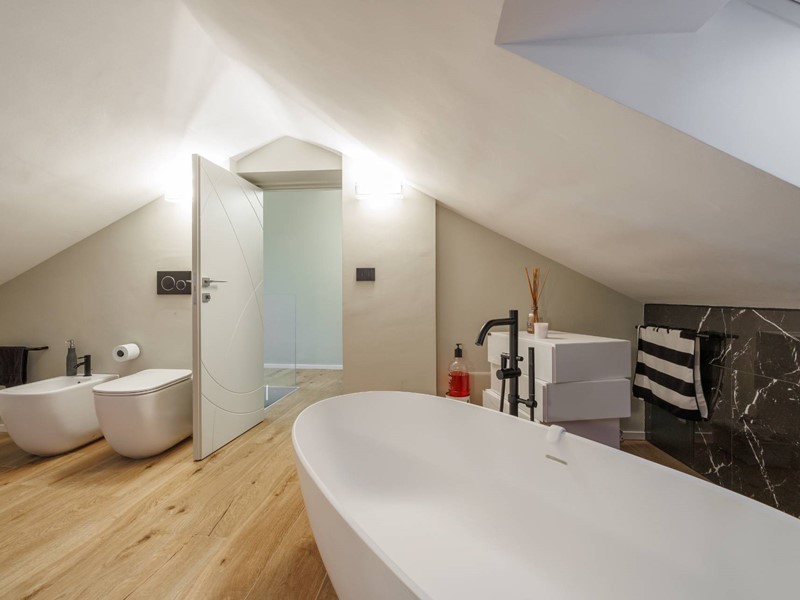 piano 7: una bella scale di design conduce al piano superiore in cui troviamo una grande camera doppia, un bagno con vasca (lavabo e specchio firmati Antonio Lupi) e un accesso su un terrazzino panoramico;