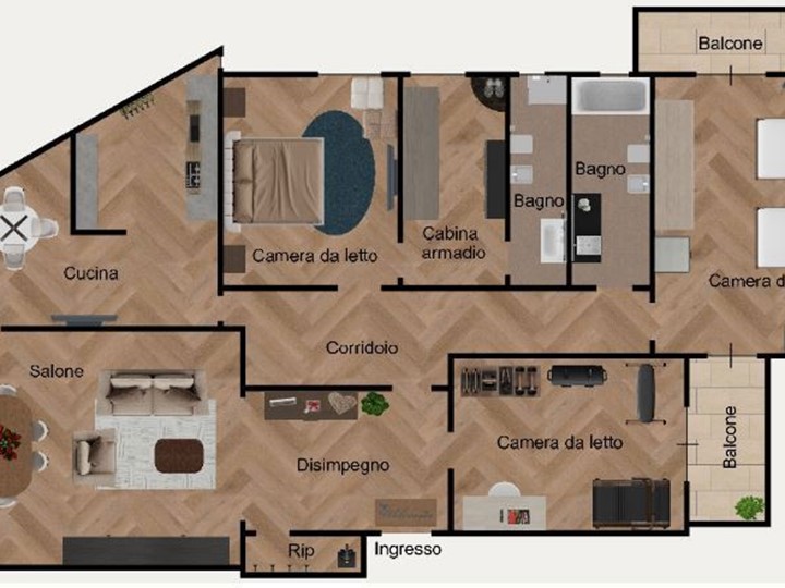 L'ingresso conduce a un immenso salone doppio, ideale per creare una zona living elegante e accogliente. A sinistra troviamo la cucina abitabile, luminosa e funzionale. La zona notte offre una camera padronale con cabina armadio finestrata e bagno in stile americano, una seconda camera con doppio punto luce grazie ai due balconi con esposizioni differenti e una terza stanza versatile, perfetta come studio, hobby room o ulteriore camera da letto.