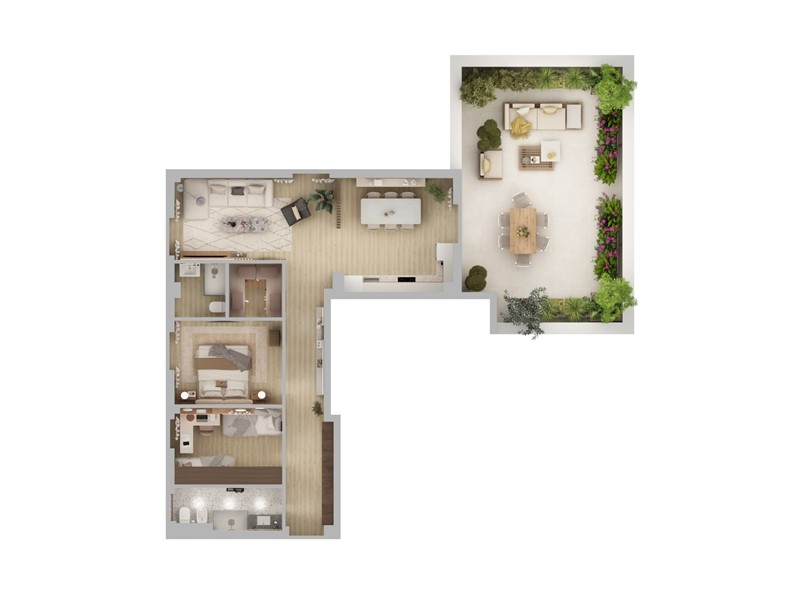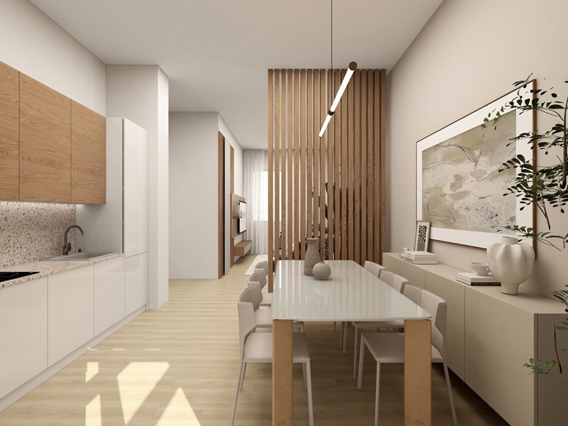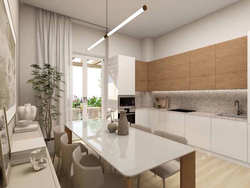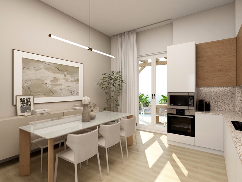 La zona giorno gode di una TRIPLA esposizione che garantisce una luminosità eccezionale a tutte le ore del giorno, la disposizione razionale dona spazi ampi alla preparazione dei cibi, alla zona pranzo e al living. Infine l'accesso sul bellissimo terrazzo attrezzato di predisposizione caldo/freddo per l'installazione di una pergola bioclimatica, parapetto in vetro fumé, impianto di irrigazione e illuminazione Led.