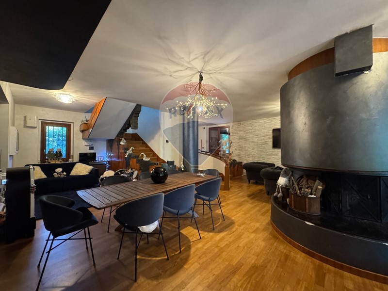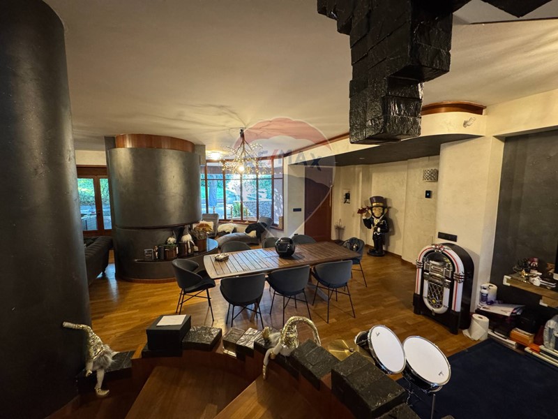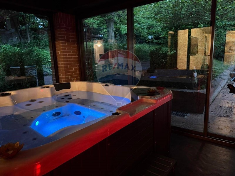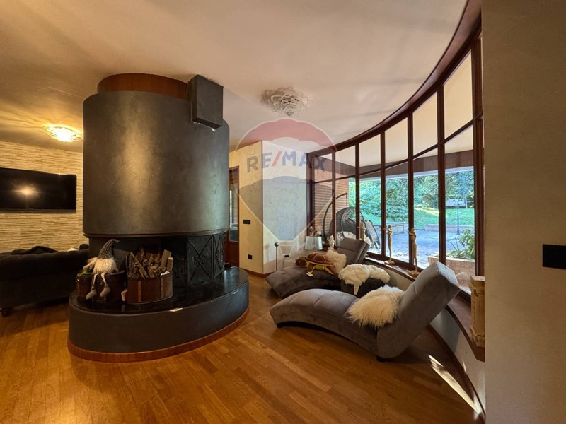 La zona living di rappresentanza è un luogo adibito alla condivisione, ma anche un ambiente dove trascorrere momenti in totale relax con il camino circolare centrale e la sala idromassaggio con affaccio sul giardino esterno.
