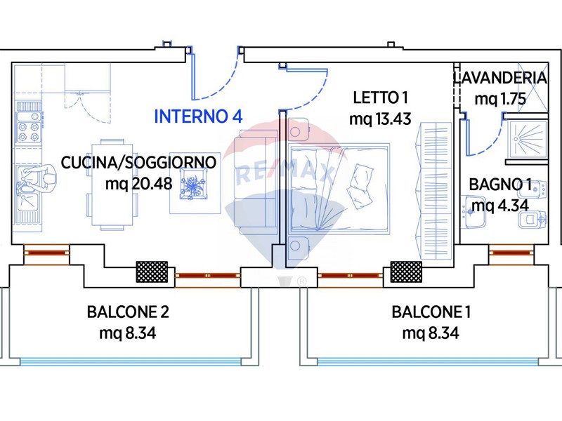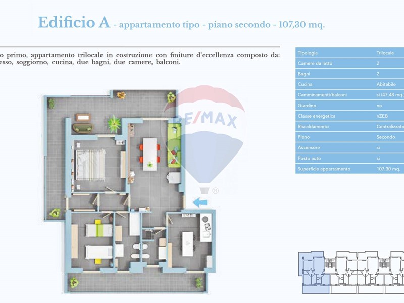 79,62 mq ingresso/soggiorno/angolo cottura, 2 camere, 1 bagno, 1 ripostiglio, 2 balconi da 28,03 mq