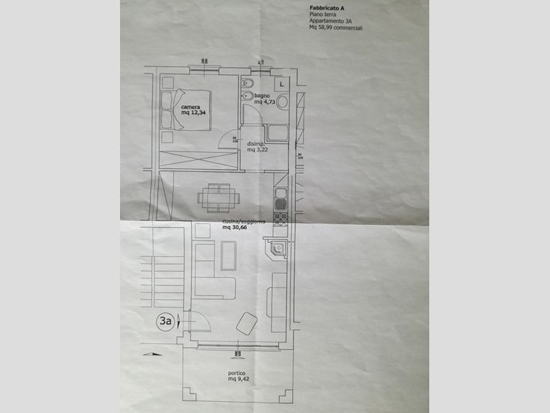L'appartamento è composto da: ingresso, zona giorno con cucina a vista, locale disimpegno con caldaia, bagno con box doccia e camera matrimoniale. Portico esterno di circa 10 mq e piccolo giardinetto. Box di proprietà.