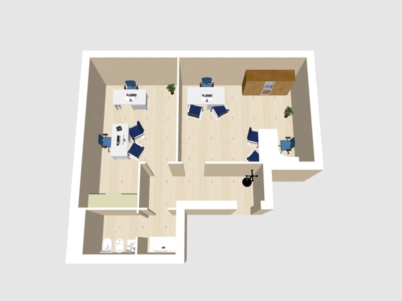 Gli spazi risultano funzionali e ben distribuiti: ingresso; due camere/uffici; bagno con antibagno e ripostiglio.