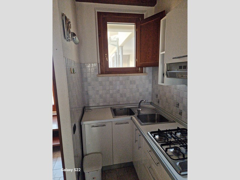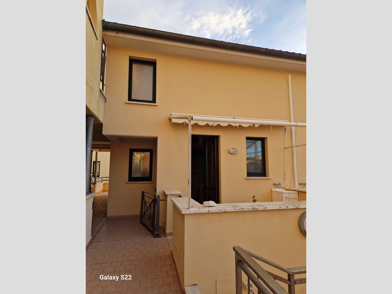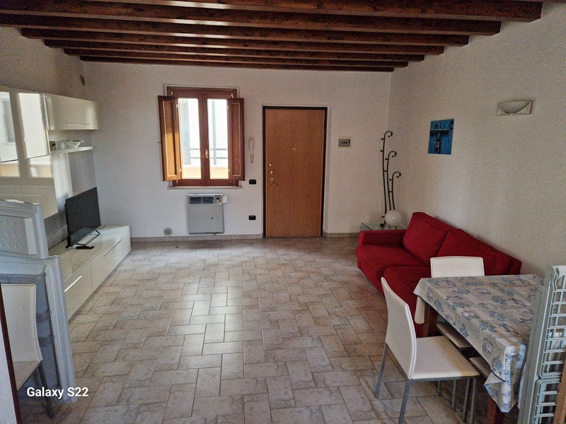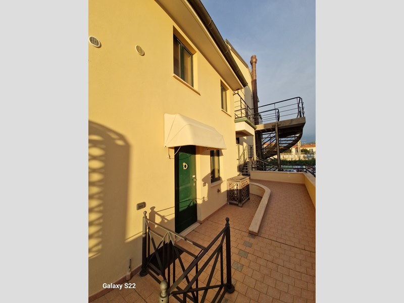 Appartamento in affitto annuale, contratto 4+4, disposto su due piani, 1° e 2°, con ingresso da Corso Italia e da via San Francesco, composto al piano primo da soggiorno con angolo cottura e terrazzo con vista sulla piscina condominiale. Al piano secondo, accessibile da scala in legno, un bagno e una camera tripla (letto matrimoniale e letto singolo.