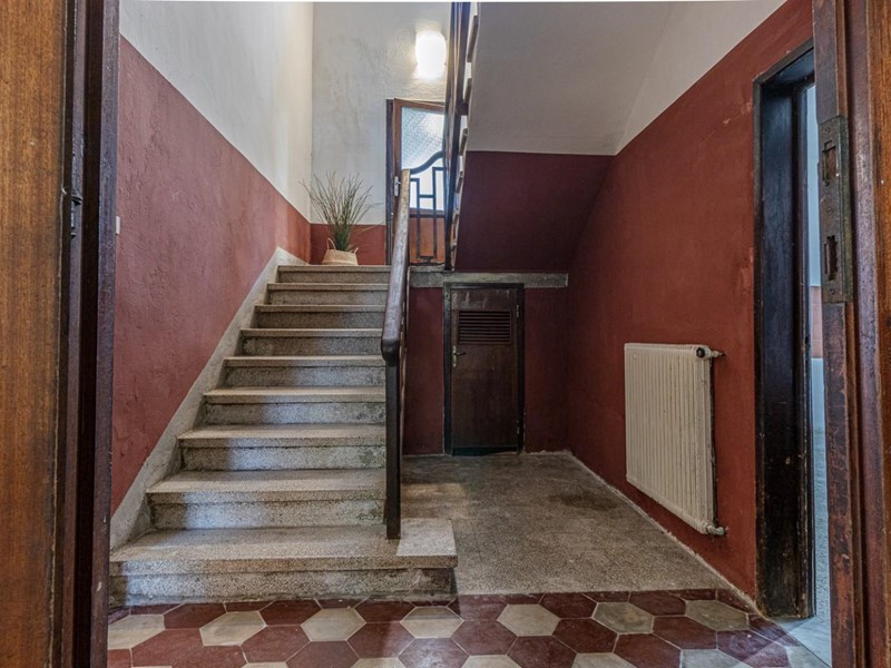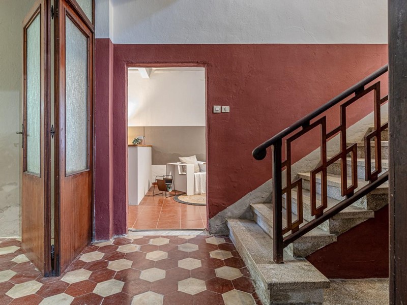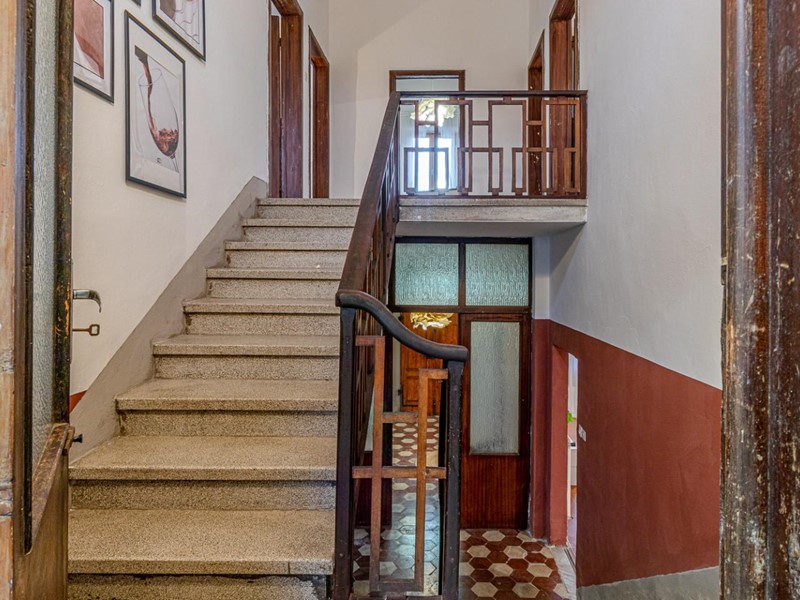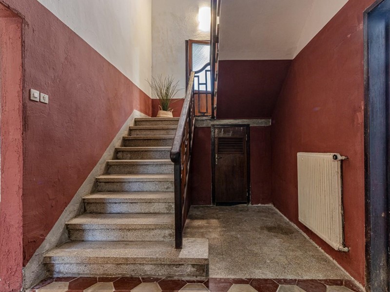 La scala in graniglia con parapetto in legno arriva al primo piano passando da una pianerottolo mezzanino con bagno di servizio.