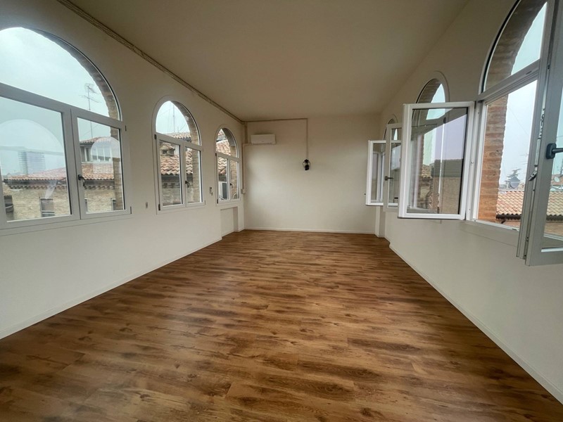 Appartamento con terrazza loggiata e possibilità posto auto in vendita a Ferrara, via Saraceno. Sito al terzo ed ultimo piano di palazzo servito da ascensore, vendiamo luminoso appartamento disposto su unico livello, così composto: ingresso, soggiorno, cucina abitabile, due camere da letto (una matrimoniale e una comoda singola). Bagno con finestra. Splendido terrazzo loggiato di circa 40 mq con vista sui tetti di Ferrara, climatizzato e riscaldato con pompa di calore, finestre nuove che lo rendono fruibile come zona giorno - salotto.