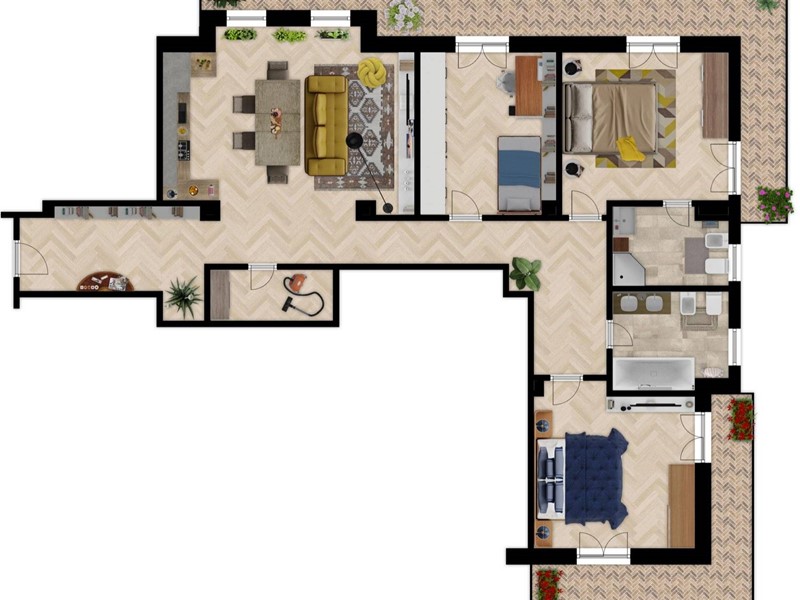La superficie dell'appartamento e l'ampiezza dei vani permettono di ridistribuire gli spazi interni e di realizzare un secondo bagno ed una terza camera da letto.