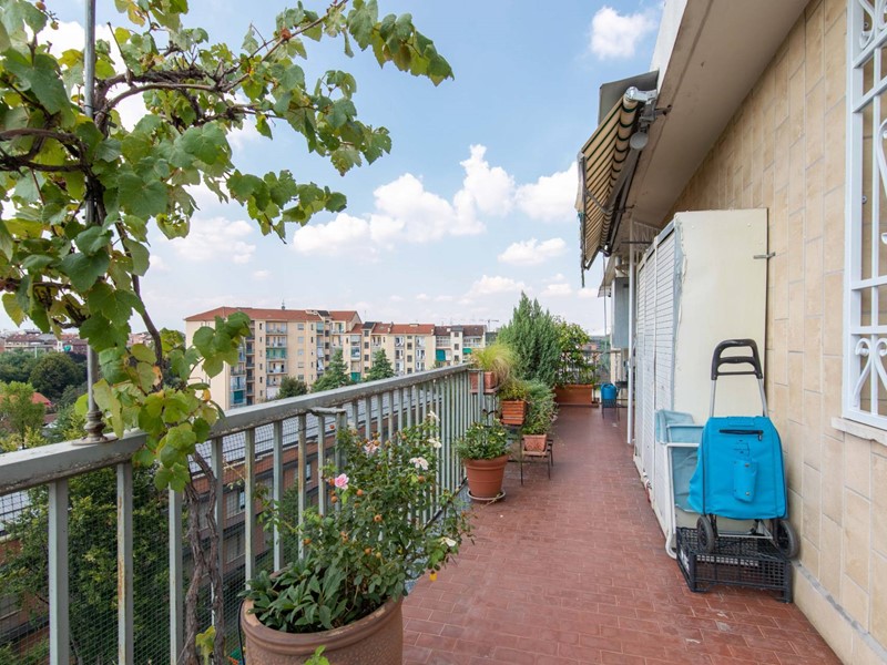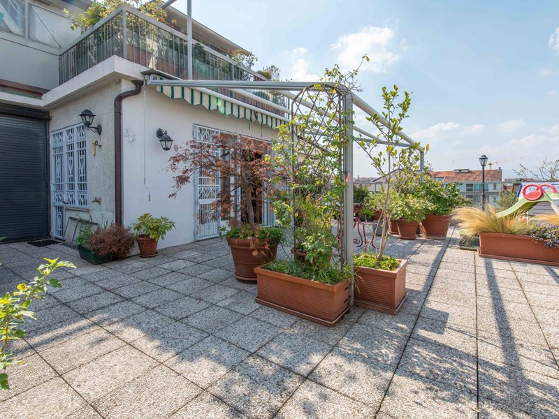 Il grande terrazzo esposto a nord-ovest, interamente manutenuto nel 2007 (mentre il terrazzo lato via nel 2025), dotato di impianto di irrigazione automatizzato e temporizzato, risulta attrezzato con una regolamentare tettoia per area pranzo, una ulteriore tenda da sole e un ripostiglio per gli attrezzi.