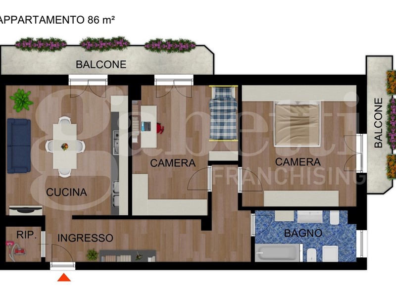 Sono 86 mq distribuiti con intelligenza: un lungo disimpegno collega la zona giorno alla zona notte, creando equilibrio e armonia tra gli spazi. Il soggiorno con la cucina a vista dialogano perfettamente con la lunga balconata accessoriata di tende da sole, mentre la zona notte offre due camere di cui una con accesso al secondo balcone e bagno, pronta a ospitare le tue giornate senza stravolgere nulla.
