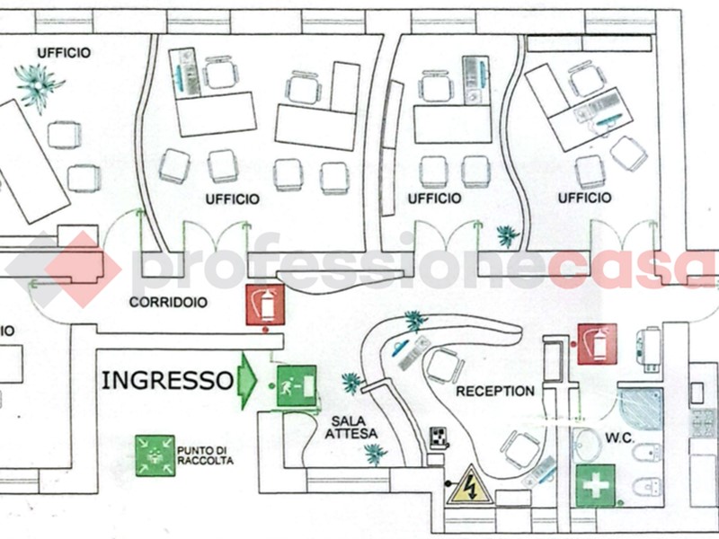 L'immobile ristrutturato, è sito al piano rialzato di un palazzo dotato di ascensore. Gli spazi interni, caratterizzati da soffitti alti, offrono ambienti luminosi e spaziosi. L'ingresso si apre su una comoda sala di attesa con reception, a cui seguono cinque uffici indipendenti, un locale archivio e i servizi igienici.