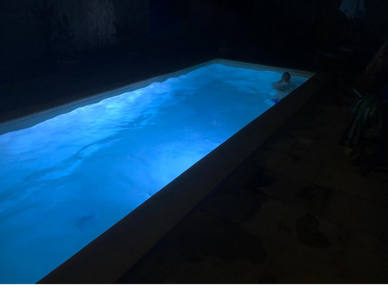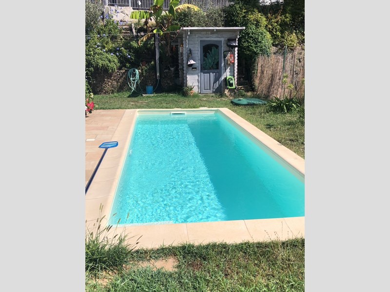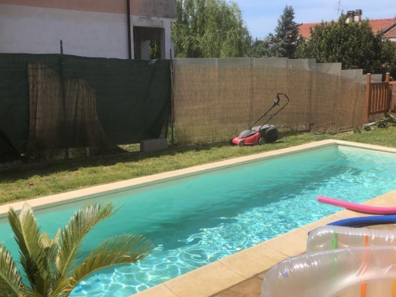 Giardino attrezzato con piscina privata, tenda bioclimatica, BBQ, irrigazione e spazi esterni completi.