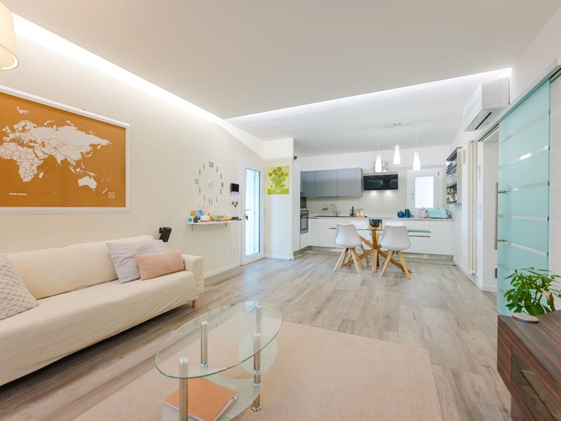 L'appartamento di circa 80 mq è così composto: ingresso su soggiorno openspace con cucina a vista, e terrazzo esterno .