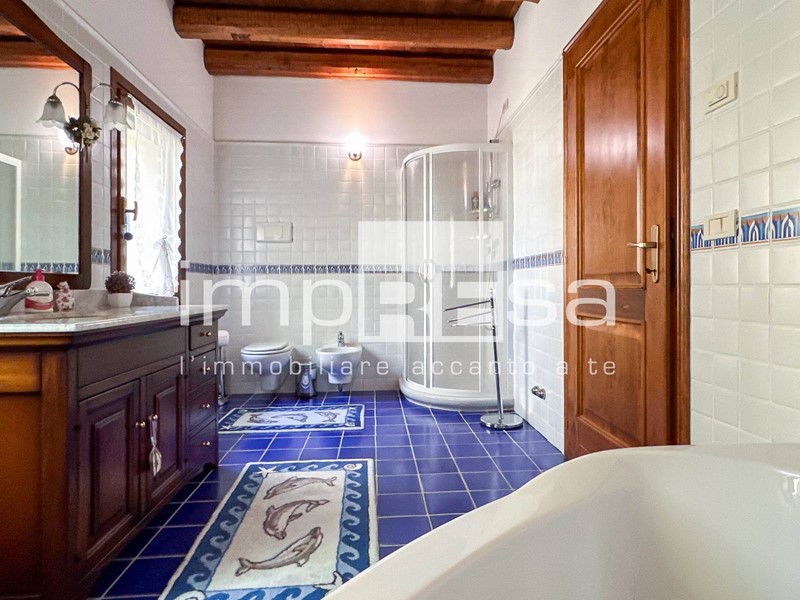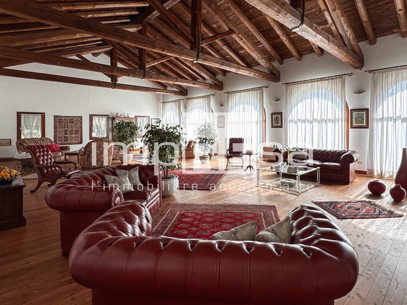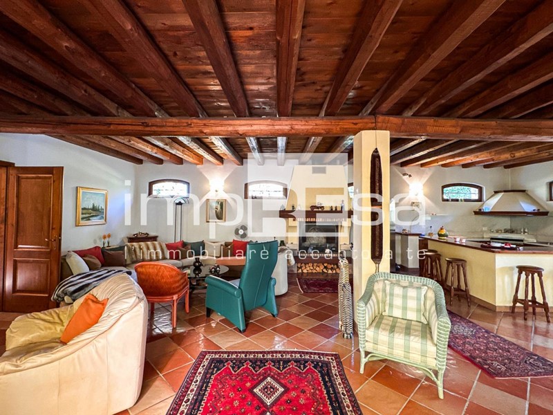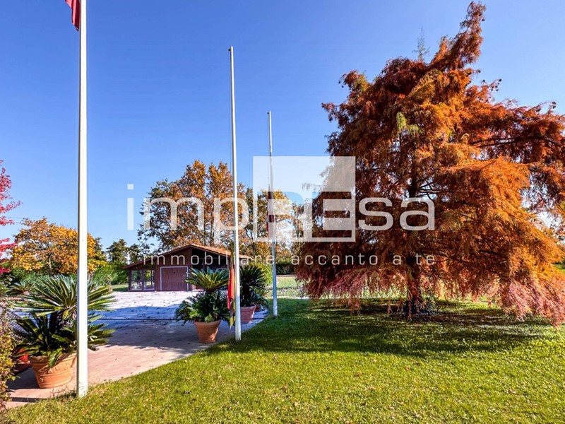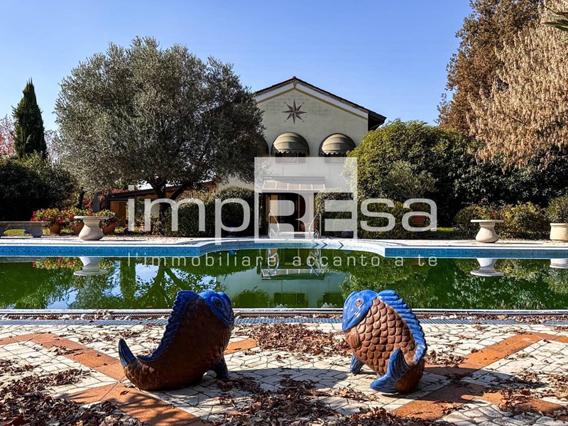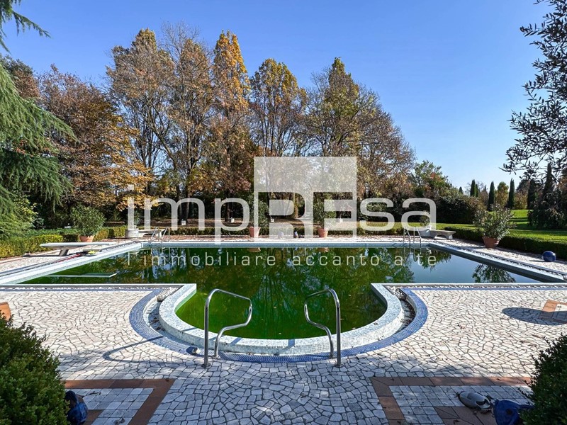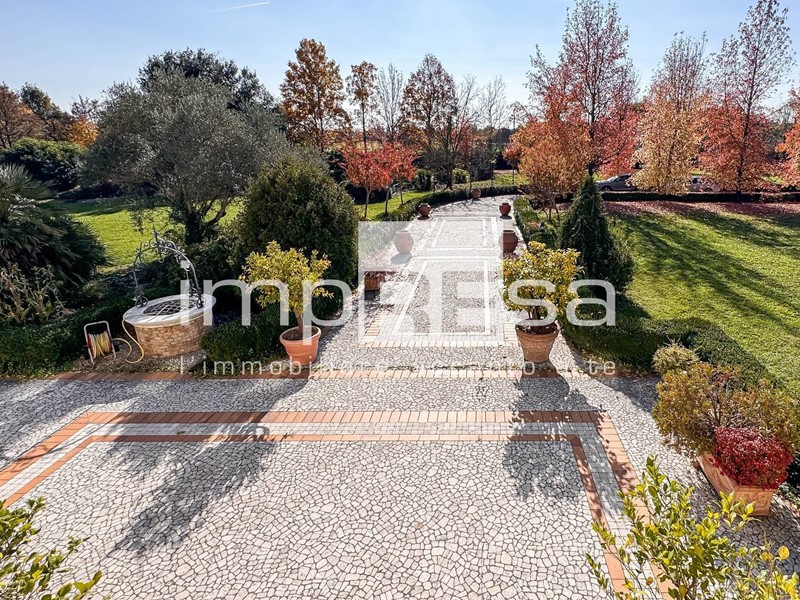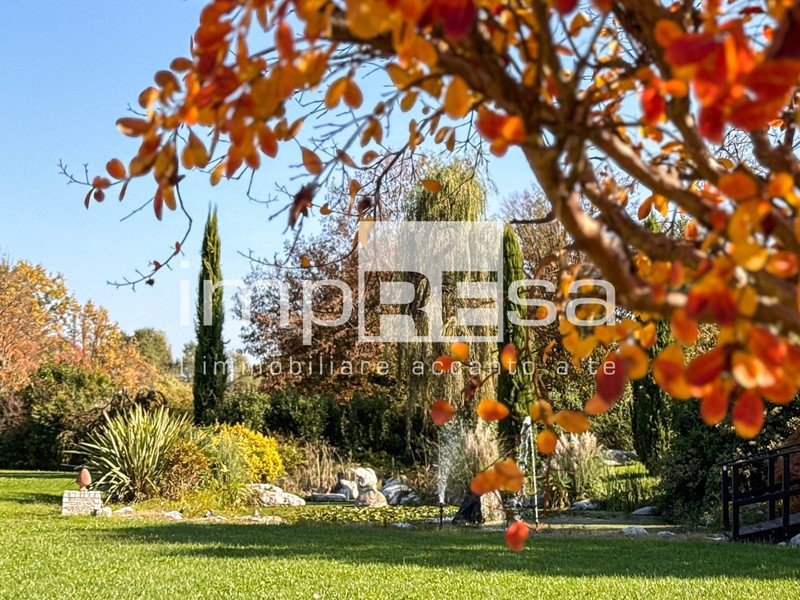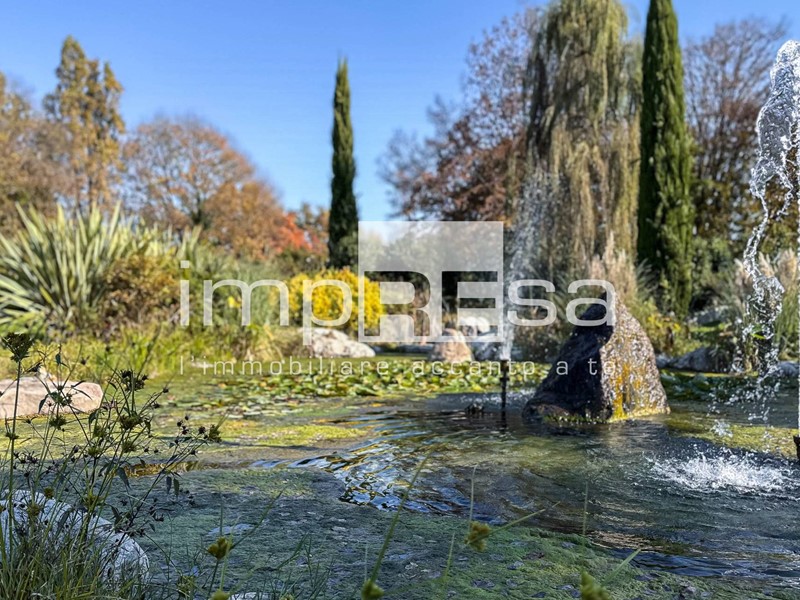 Allesterno, il parco si apre come un piccolo mondo a sé: la piscina dotata di impianto di riscaldamento, alberi e prati curati e un suggestivo laghetto creano unoasi di pace dove il silenzio e la natura si fondono in perfetto equilibrio. La totale recinzione garantisce privacy e sicurezza assoluta, grazie anche all'impianto d'allarme presente nella struttura.