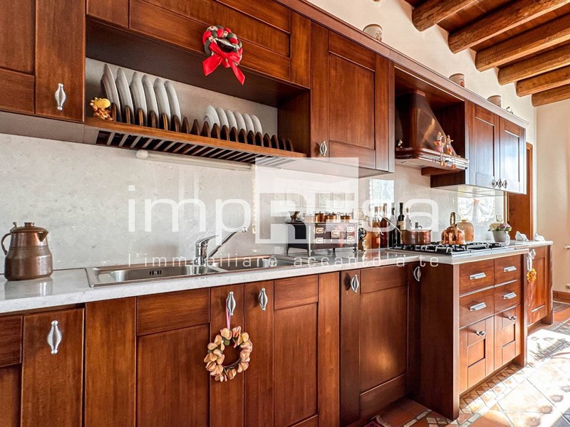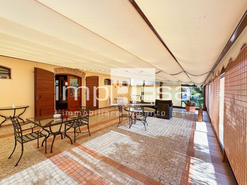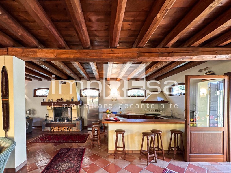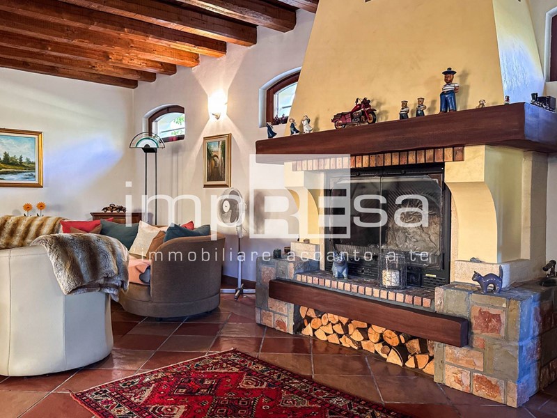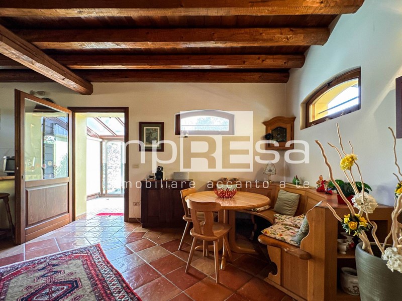 Appena varcato il portone dingresso, si viene accolti da una zona giorno, dominata da un grande camino in stile larin. Gli ambienti sono ampi, luminosi e perfettamente distribuiti: il soggiorno, la cucina abitabile e la taverna con accesso ad una veranda con struttura frangisole permette di vivere il giardino in ogni stagione.