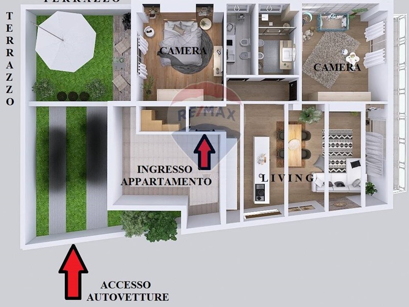 L'appartamento al piano terra rialzato ha l'accesso carrabile indipendente che porta ad un terrazzo privato utilizzabile sia come parcheggio che come area esterna attrezzata per l'estate. Gli interni del piano terra comprendono un ampio soggiorno con angolo cottura, tre camere da letto, un bagno principale e una lavanderia con doppio servizio, inoltre l'appartamento gode di doppia esposizione; l'immobile è dotato di impianto autonomo di riscaldamento e raffrescamento tramite fancoil, cappotto termoisolante, infissi a taglio termico di ultima generazione, pannelli fotovoltaici.