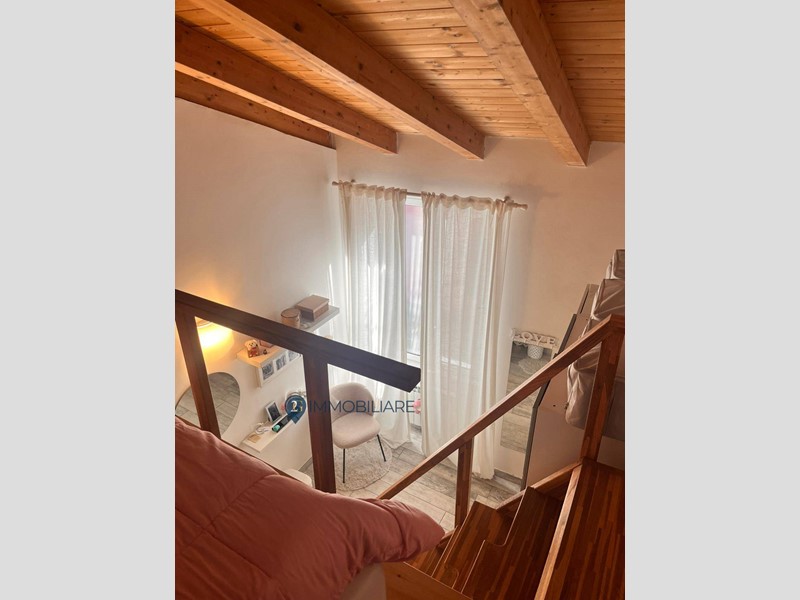 Secondo piano: camera da letto matrimoniale con soffitto con travi in legno a vista e soppalco da usare come ripostiglio , 2 camera con travi in legno a vista e soppalco vivibile con scala fissa in legno.