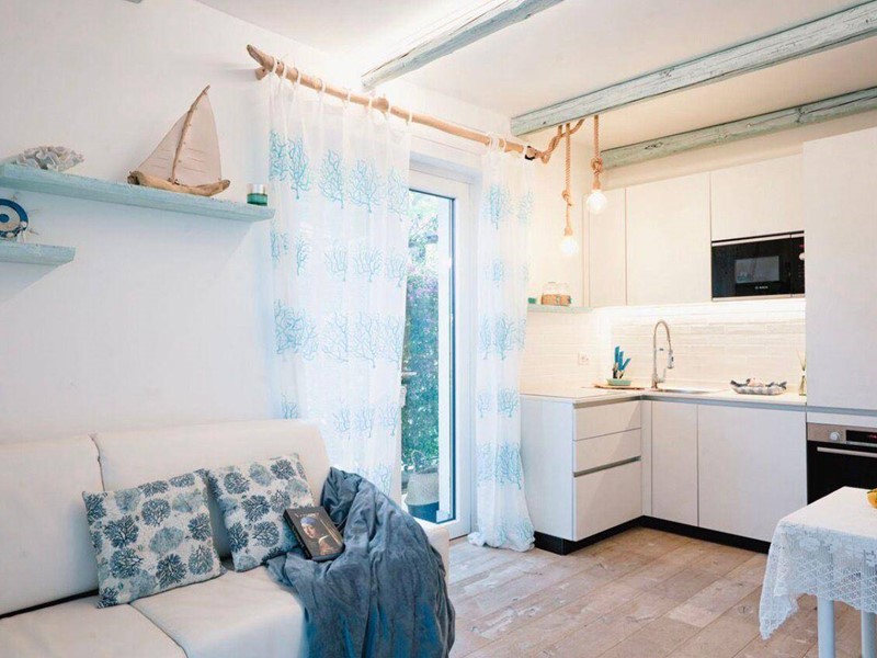 E' composto da: soggiorno con angolo cottura, camera, bagno finestrato e giardino privato.