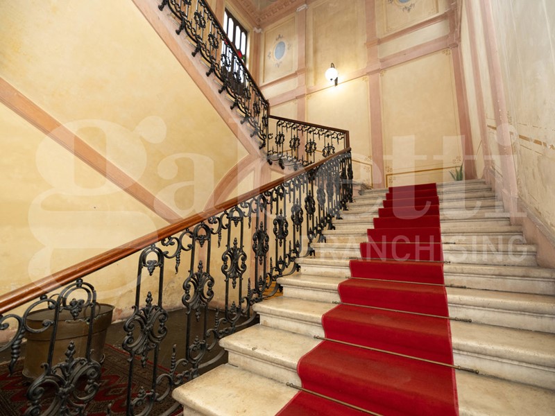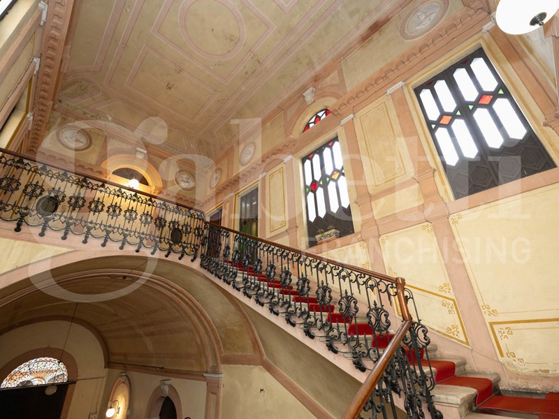 Una scenografica scala monumentale, impreziosita da altorilievi, pitture e ringhiere artistiche in ferro battuto
