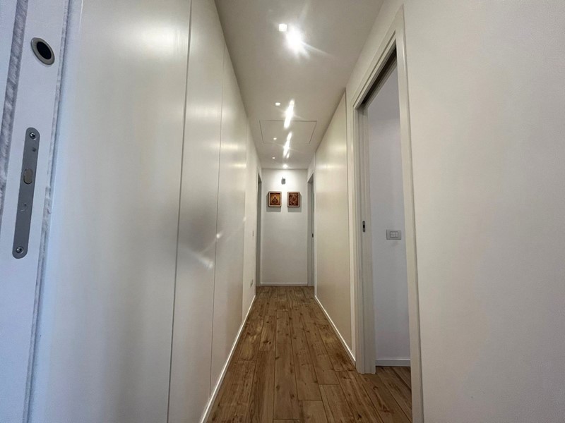 Tra le dotazioni interne figurano porta blindata, infissi in legno con doppio vetro, pavimentazione in gres porcellanato, sistema d'allarme, serrande elettriche, armadi a muro su misura, cucina su misura, climatizzazione in tutti gli ambienti abitabili, zona lavanderia a scomparsa con lavatrice e asciugatrice e zanzariere.