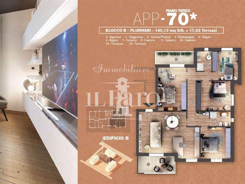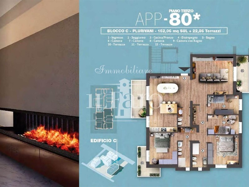 L'intervento prevede la realizzazione di 52 appartamenti in tre blocchi, tutti dotati di un posto auto di proprietà oppure volendo anche di garage di varie metrature fino ad arrivare a 54 mq ( quest'ultimi acquistabili separatamente ). L'appartamento in questione è cosi composto: Grande zona giorno, cucina abitabile, quattro camere da letto di cui due matrimoniali e due singole, bagno finestrato e tre terrazzi.
