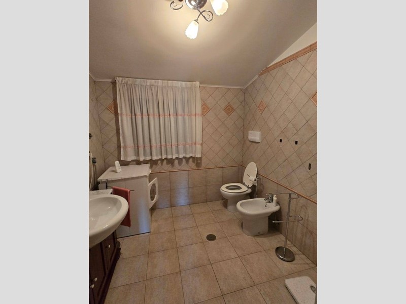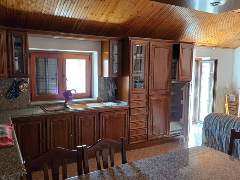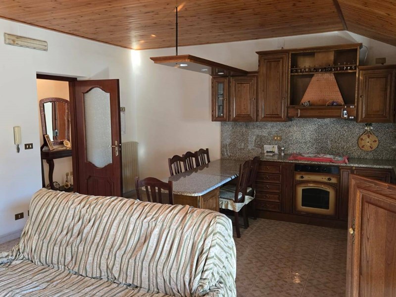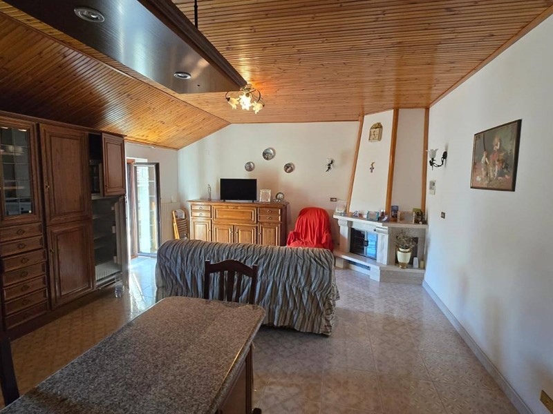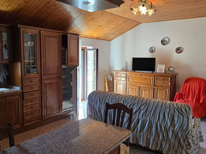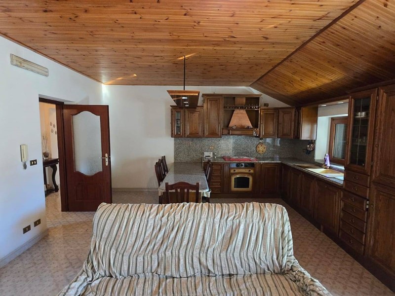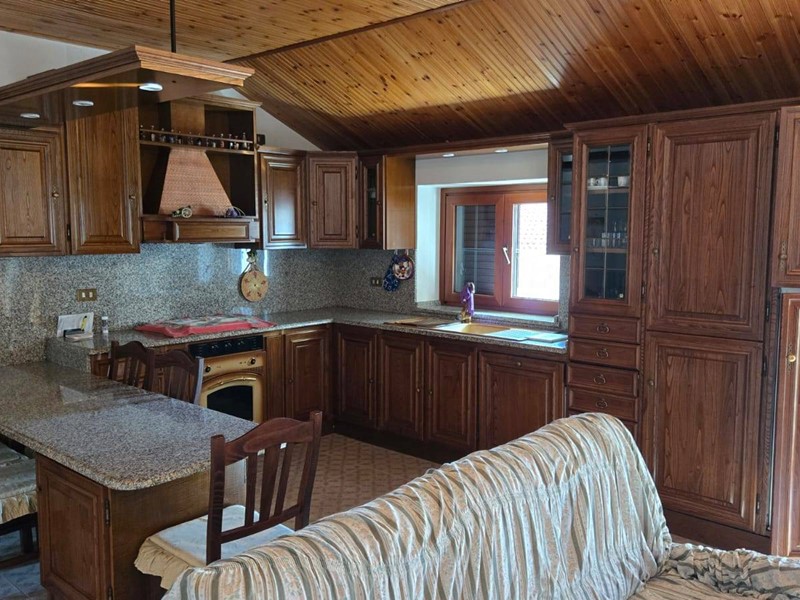 La zona giorno accoglie una sala con cucina a vista in legno massello, ampia e funzionale. La cucina è dotata di una comoda penisola, perfetta sia come piano di lavoro che come spazio conviviale. A completare, un termocamino che dona ulteriore calore e atmosfera allambiente, oltre al riscaldamento a metano.