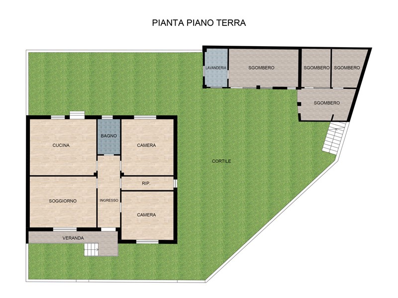 Completa la proprietà un cortile su tre lati, per una superficie complessiva di circa mq 245, in parte piantumato e dotato di accesso carrabile.