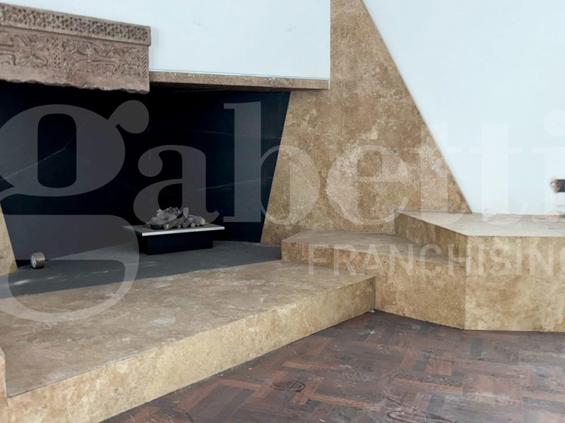 Il piano intermedio, è composto da ingresso, salone con camino, cucina , un servizio, ripostiglio e un ampio terrazzo .