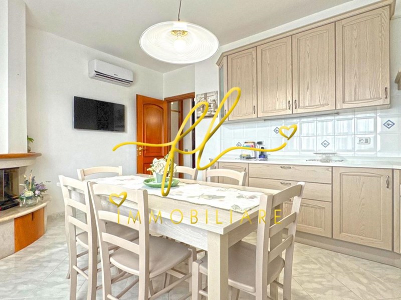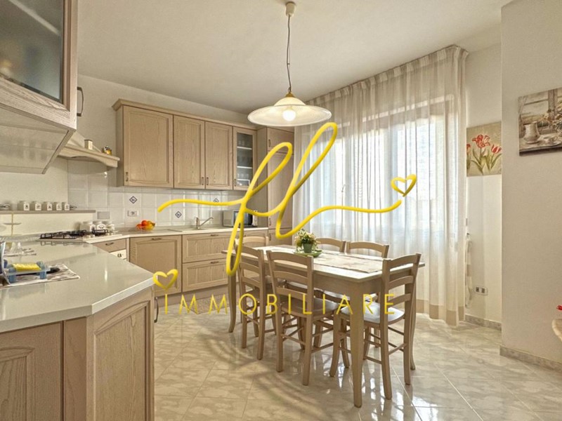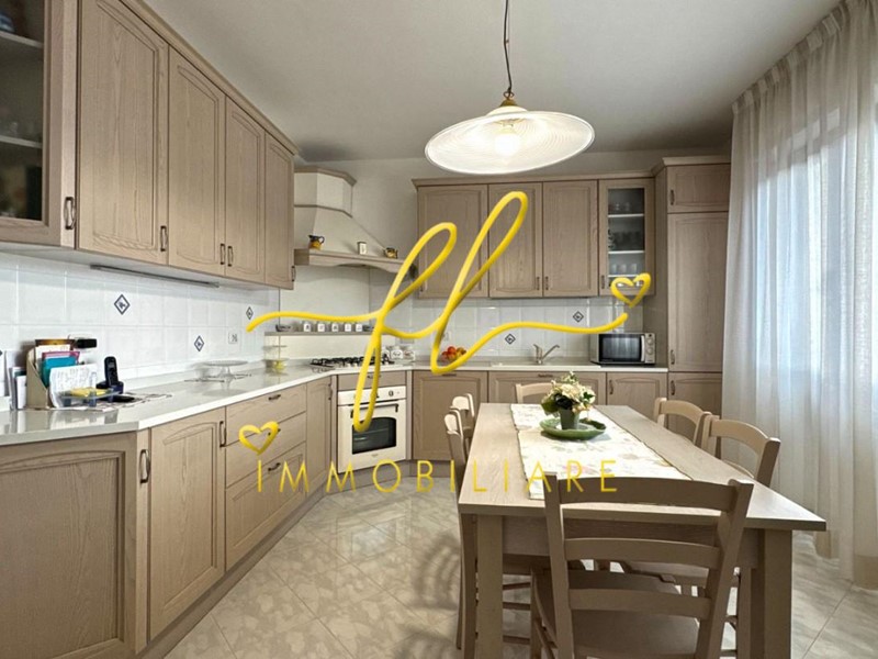 La cucina abitabile, ampia e di taglio classico-contemporaneo, è dotata di pratiche armadiature e zona pranzo. L’ambiente è reso particolarmente confortevole dalla presenza di un camino angolare e dall’accesso diretto al balcone, ideale per garantire luce naturale durante tutta la giornata grazie all’ottima esposizione Est–Sud–Ovest.