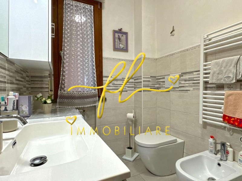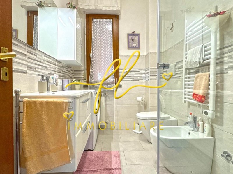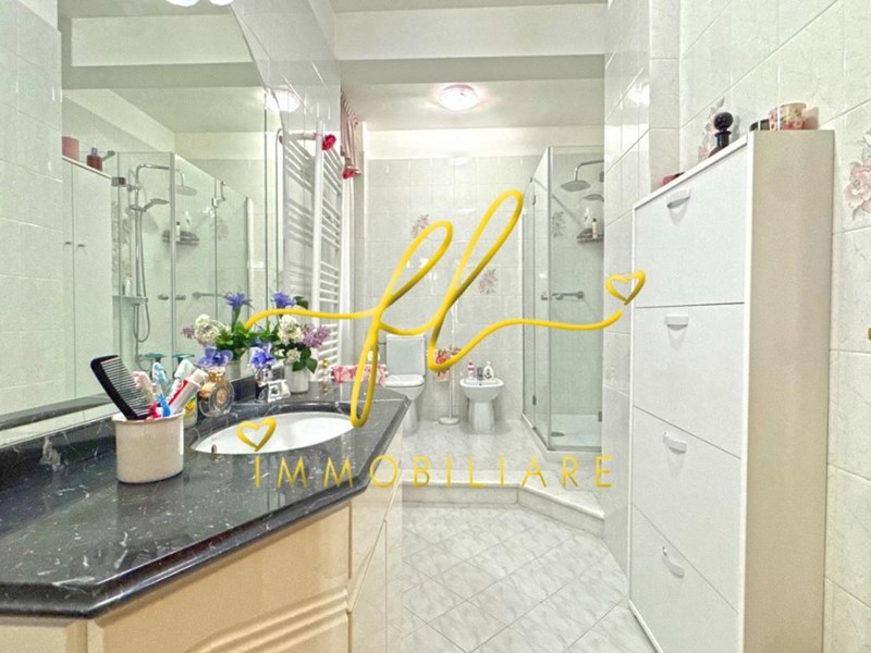 Il bagno principale, come visibile nelle foto, è moderno e finemente rifinito, dotato di doccia ampia, termoarredo e spazio lavanderia perfettamente organizzato.