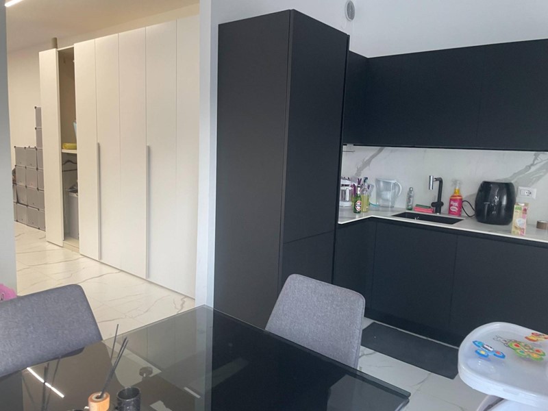 Lingresso si apre su un corridoio che accompagna alla luminosa zona living, dove troviamo la cucina a vista, moderna e funzionale, con accesso al balcone che percorre tutta la lunghezza dellappartamento.