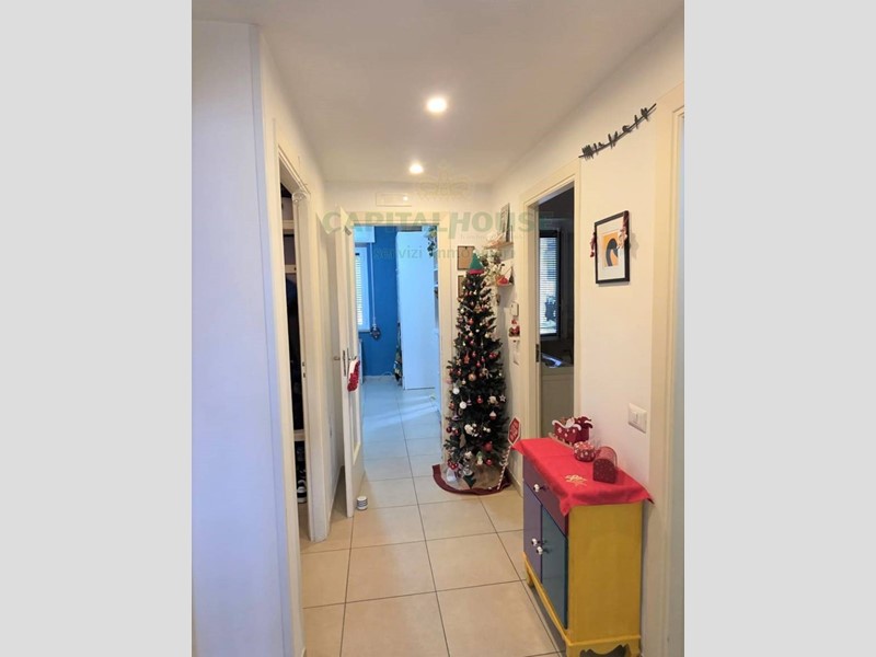La soluzione si apre su un accogliente ingresso che conduce allampia cucina abitabile, ambiente moderno e funzionale, un comodo disimpegno introduce alla camera da letto matrimoniale, la cameretta e i due servizi: un bagno principale finemente rifinito e un bagno di servizio con lavanderia, pratico e ben organizzato.