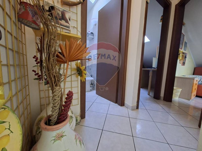 L'appartamento è collocato al 1 piano ed è composto da cucina a vista soggiorno con balcone, disimpegno, ripostiglio , camera matrimoniale con terrazza chiusa e bagno con box doccia. Dalla zona giorno si accede alla mansarda attraverso una scala a vista.