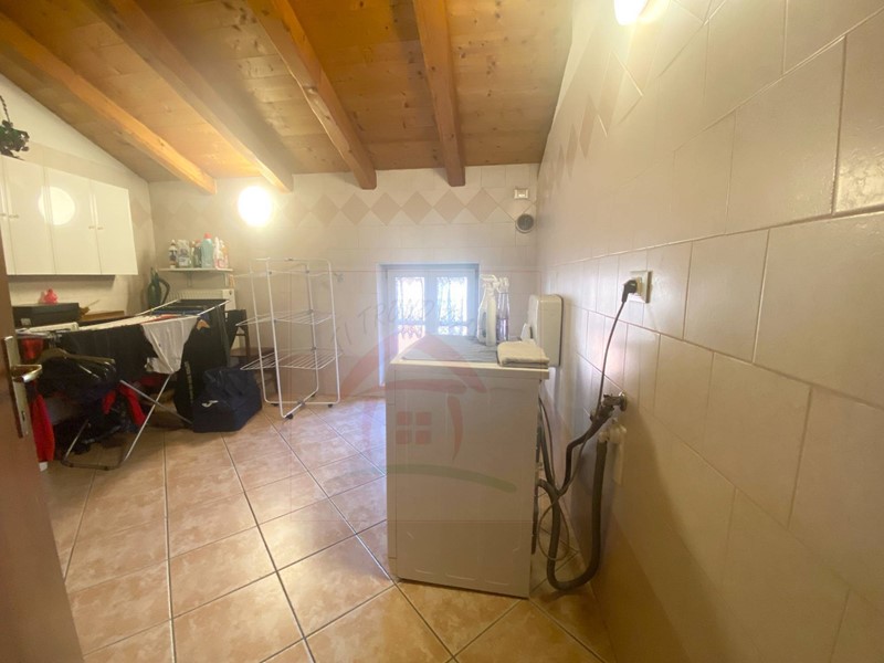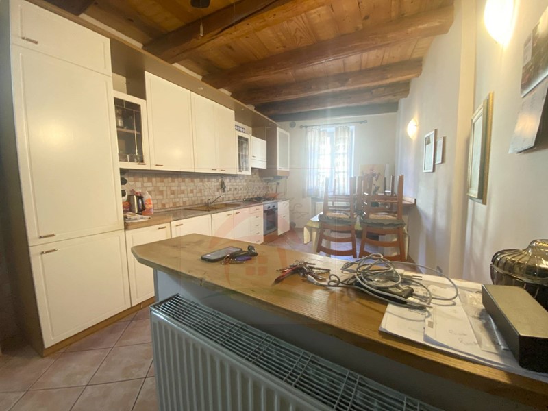 Accedendo all'appartamento ci si trova subito nella cucina/soggiorno, finestrata e caratterizzata dall'avere il soffitto in legno.