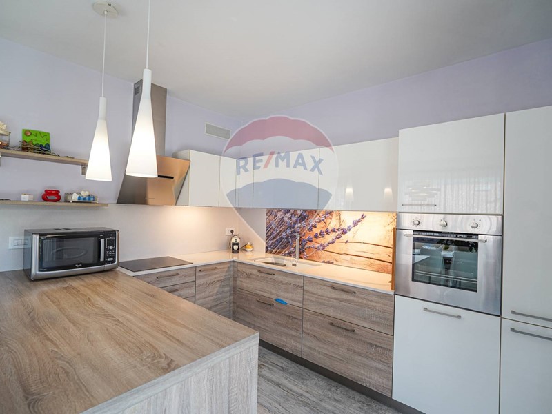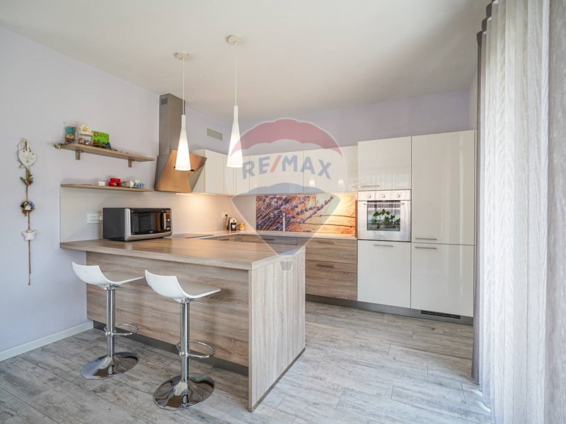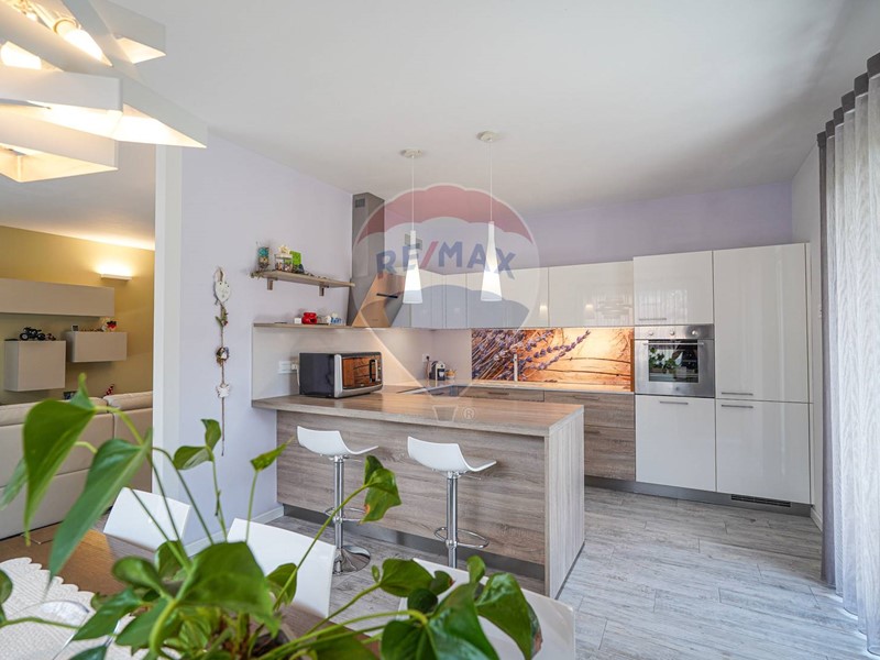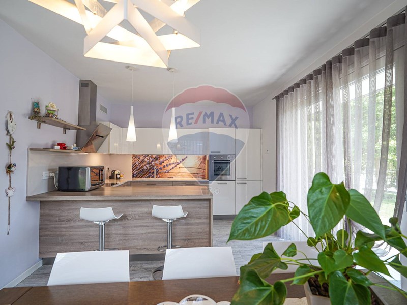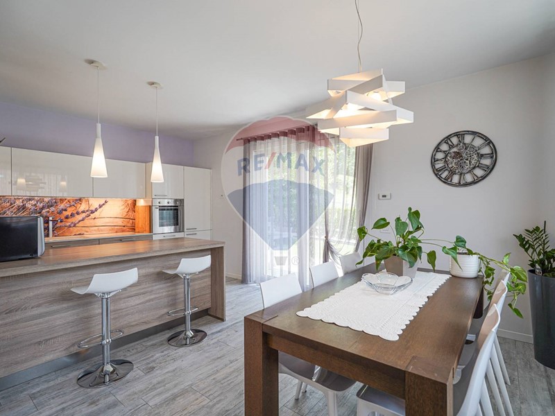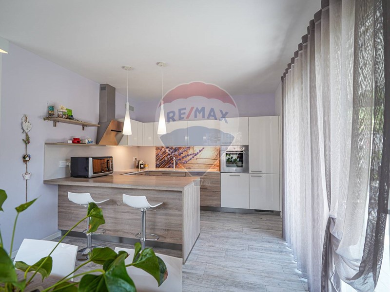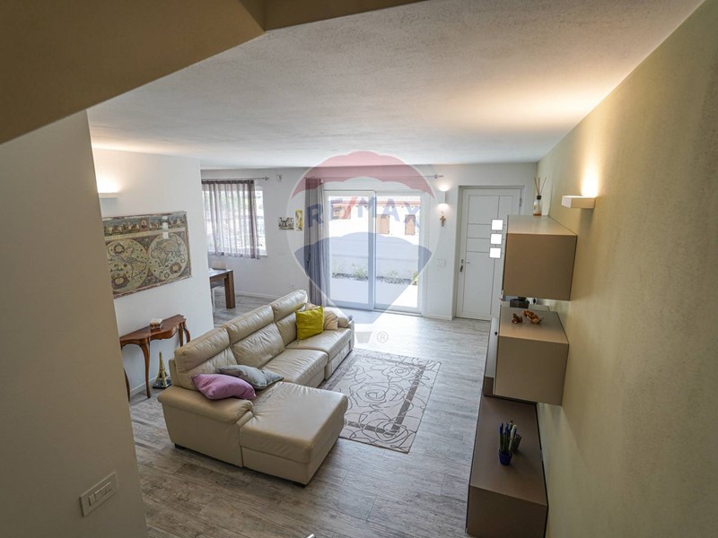 Al piano terra: luminoso soggiorno con cucina e zona pranzo open-space, ampie vetrate sul porticato e giardino, disimpegno con armadiatura su misura, locale studio/camera e bagno di servizio.