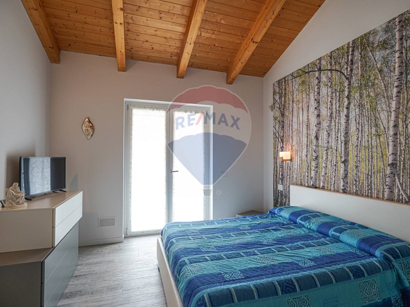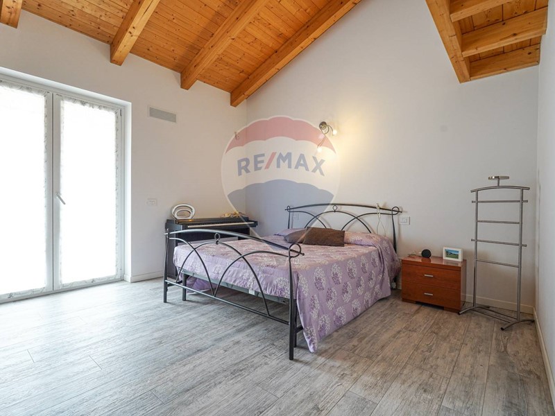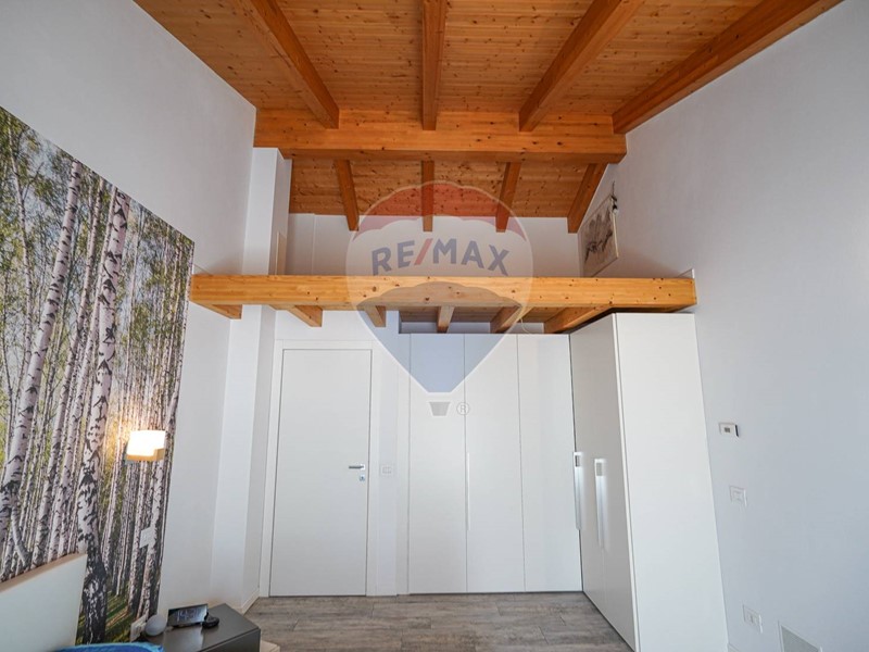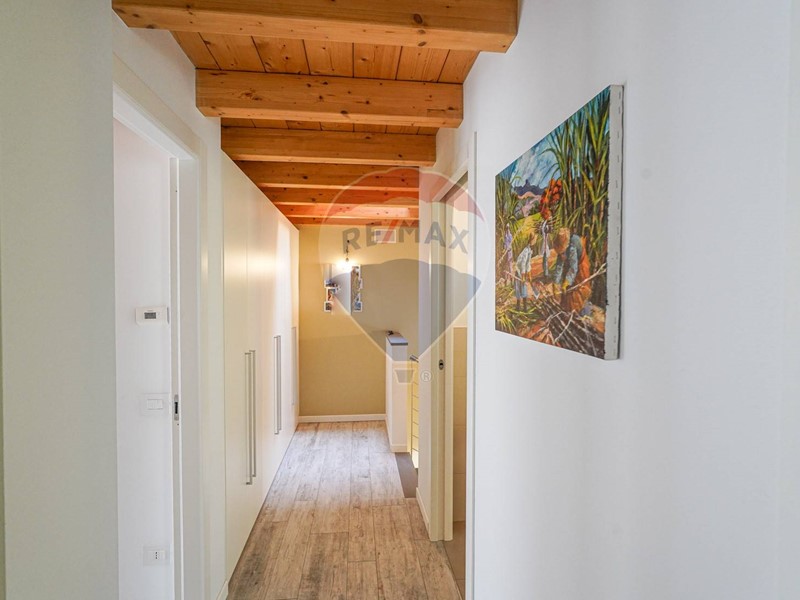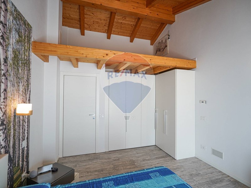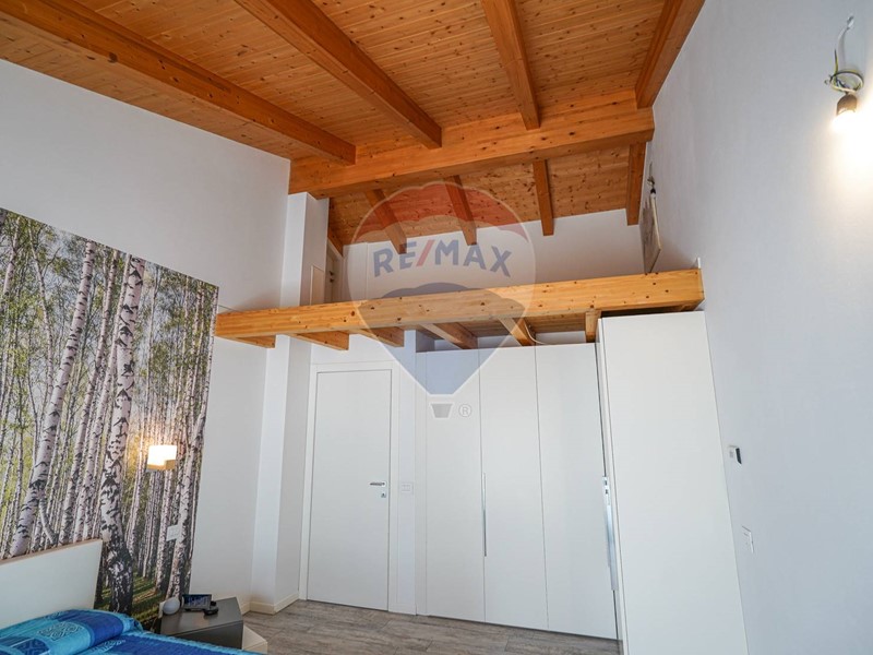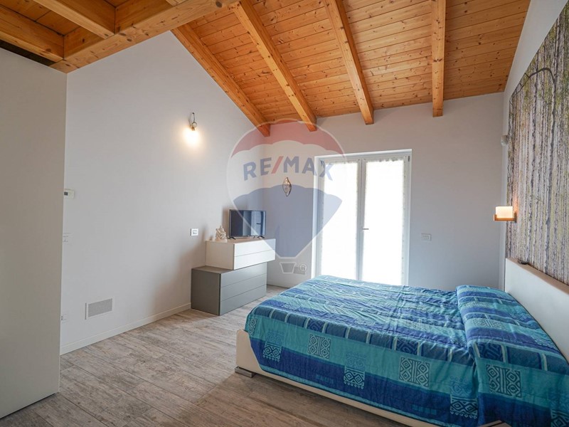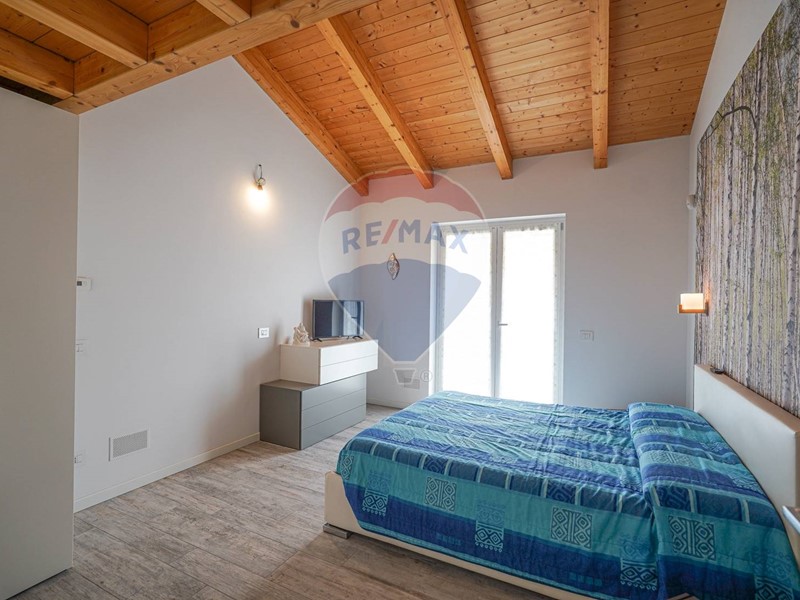 Al piano primo: tre camere da letto con travi a vista, bagno, disimpegno con armadiatura e balcone panoramico. La camera padronale è dotata di soppalco in legno, ideale come ripostiglio o zona relax.