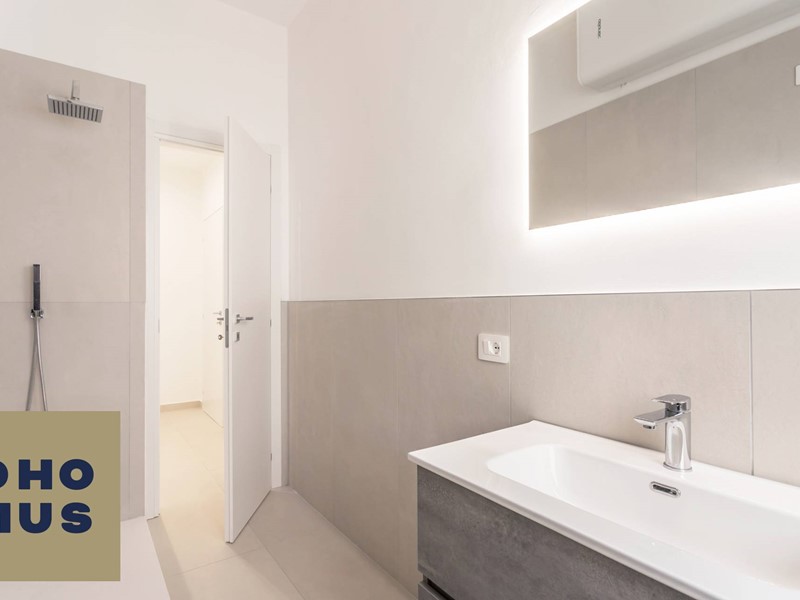 Il bagno, elegante e moderno, ti accoglie con tonalità raffinate, una doccia ampia e materiali scelti con cura.
