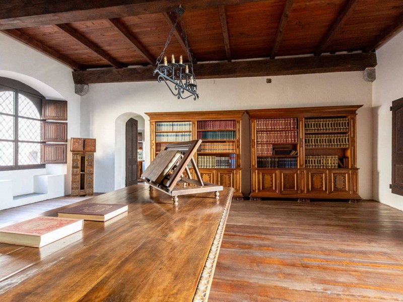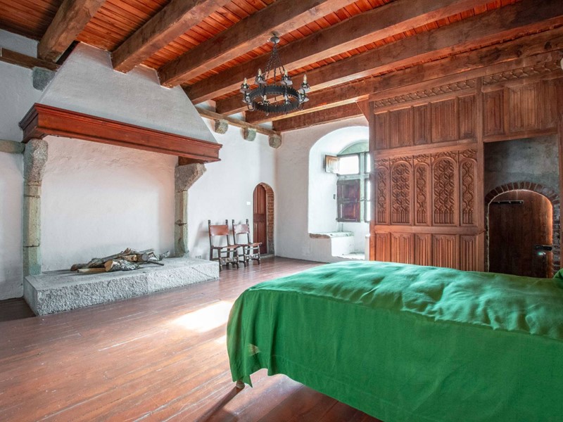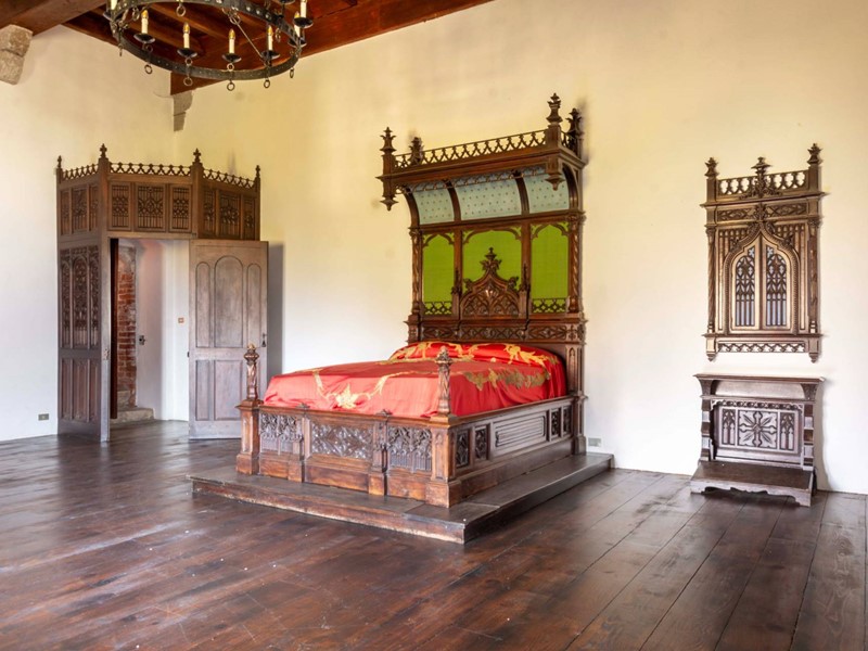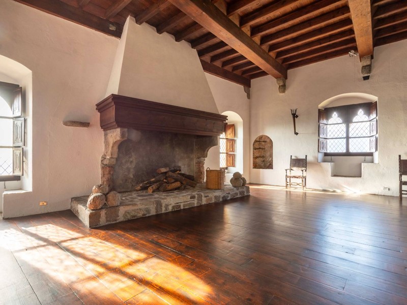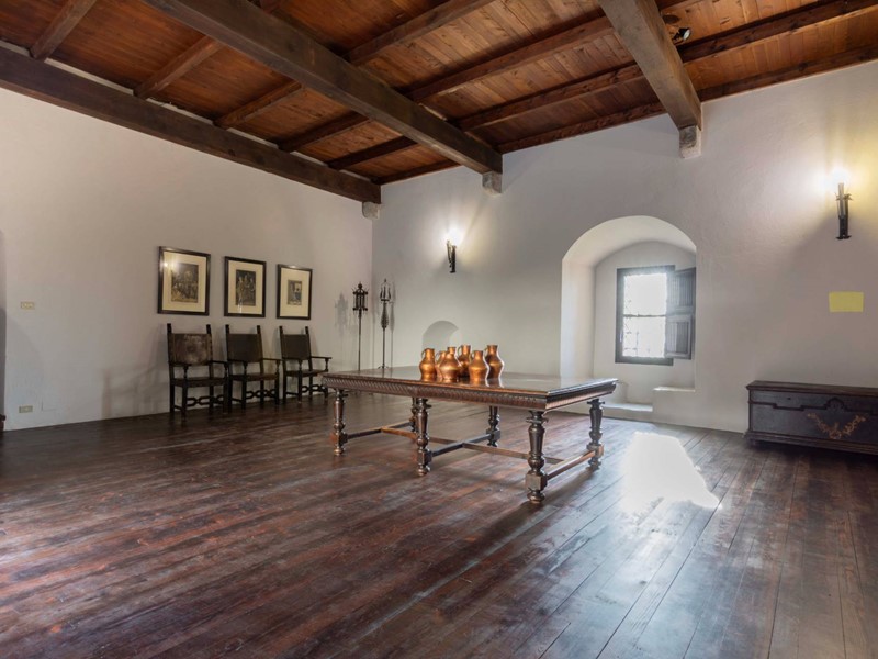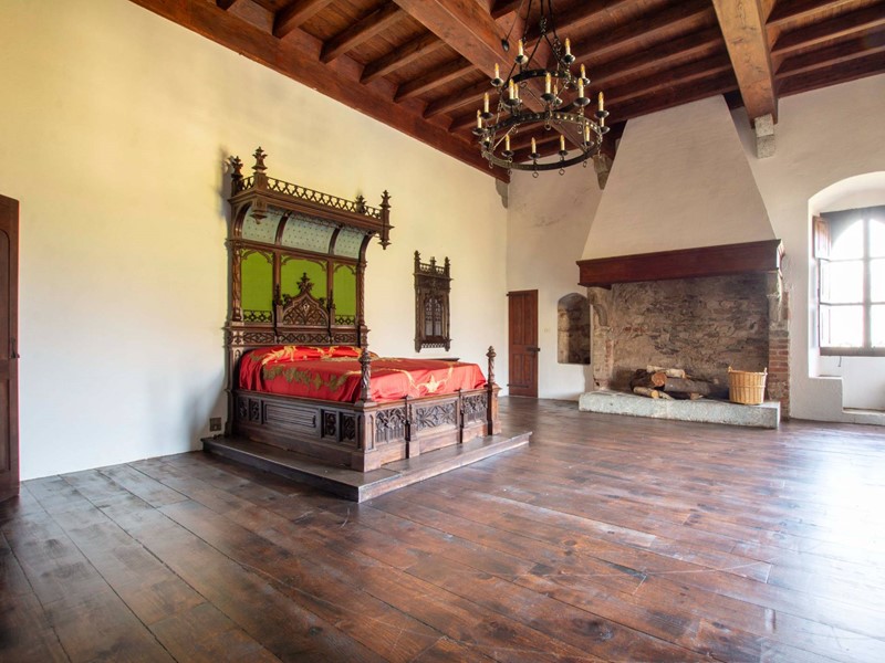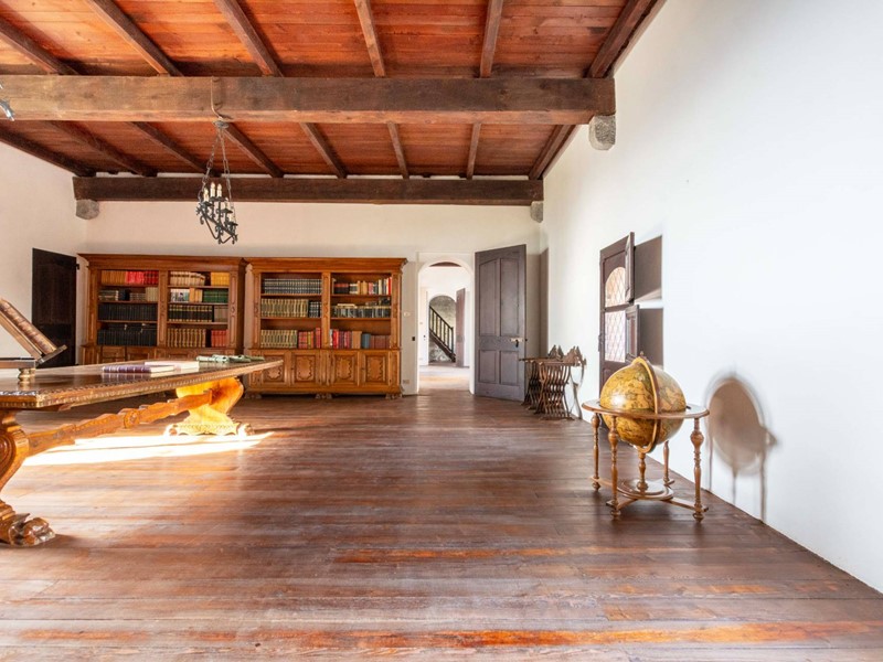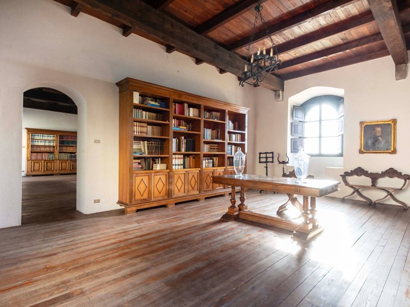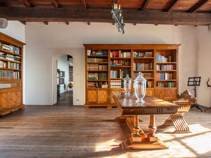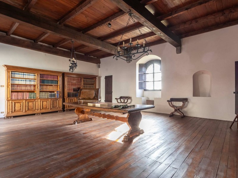 Il piano nobile concentra il cuore scenografico della dimora: grande salone con camino monumentale, sala dangolo anchessa con camino, tre camere con bagno en-suite (una nella torre quadrangolare) e due biblioteche con sala lettura. Materiali e finiture: cocciopesto, legno, pietra, soffitti a cassettoni, travi decorate, camini incisi, sottolineano il pregio del restauro e la vocazione museale dellimmobile.