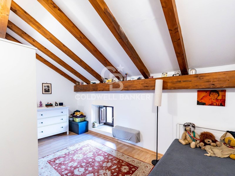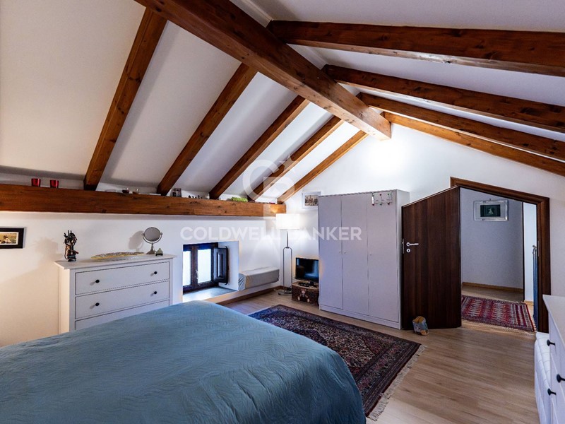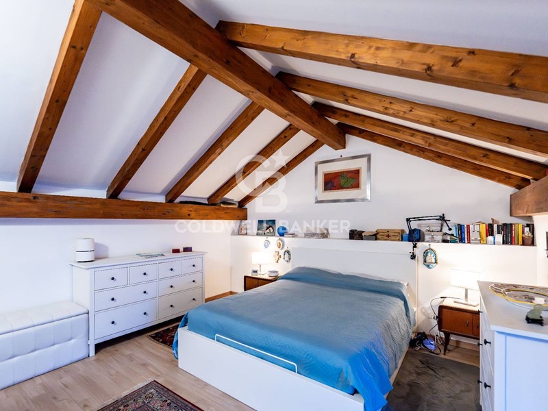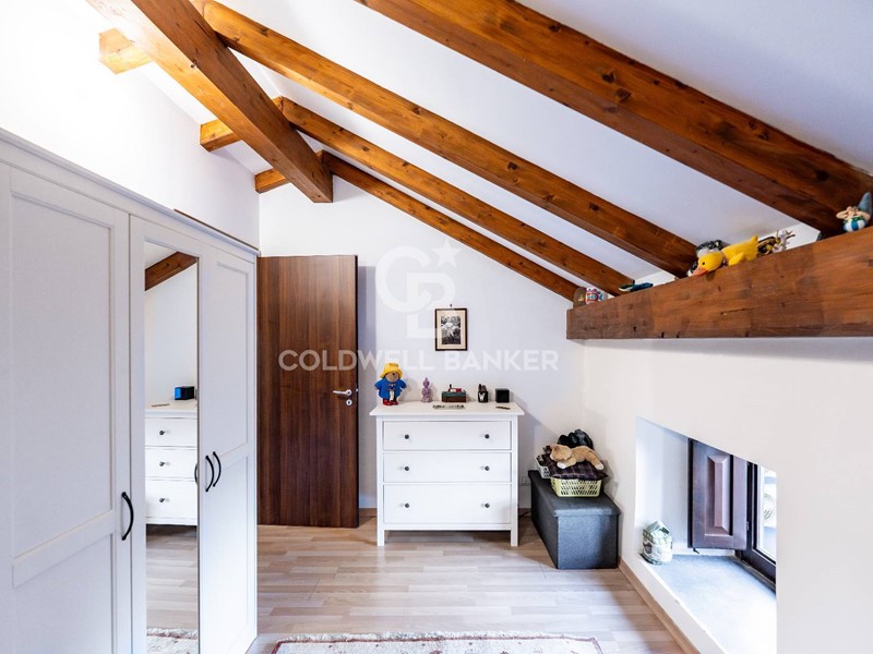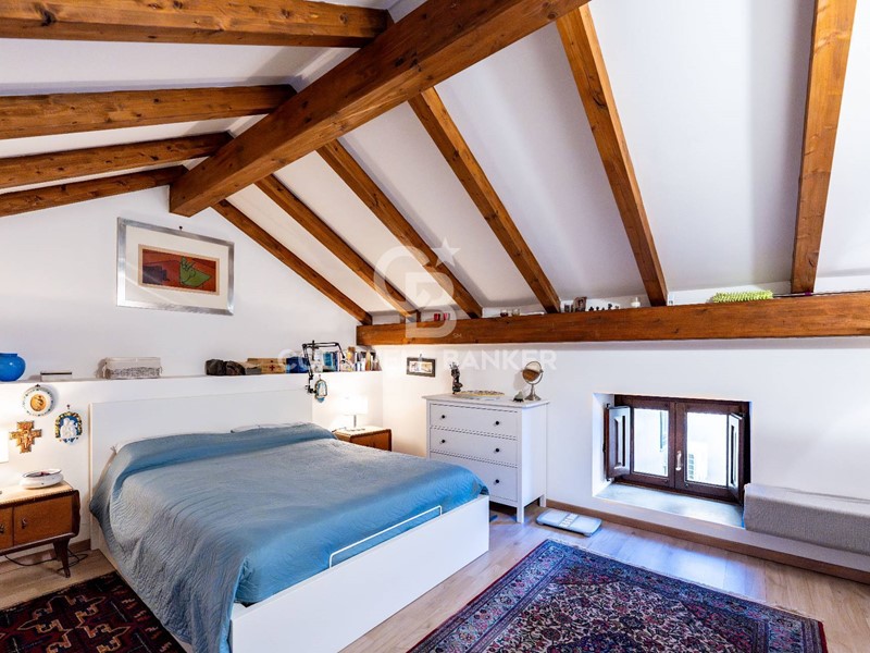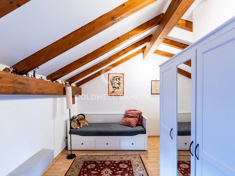 Al secondo livello, raggiungibile tramite una scala interna in legno e acciaio, si trovano due camere da letto entrambe finestrate e un ulteriore e comodo ripostiglio, anchesso finestrato. Il piano superiore presenta un suggestivo tetto a vista con travi e doghe in legno, curatissimo nei dettagli.