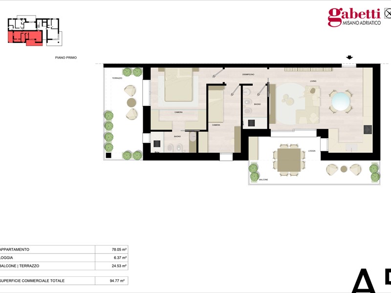 L'appartamento A5, situato al primo piano, è una soluzione dove il design contemporaneo incontra la vivibilità in ogni stagione. La generosa zona giorno si affaccia su un ampio balcone in parte loggiato, un'estensione protetta e soleggiata della casa.