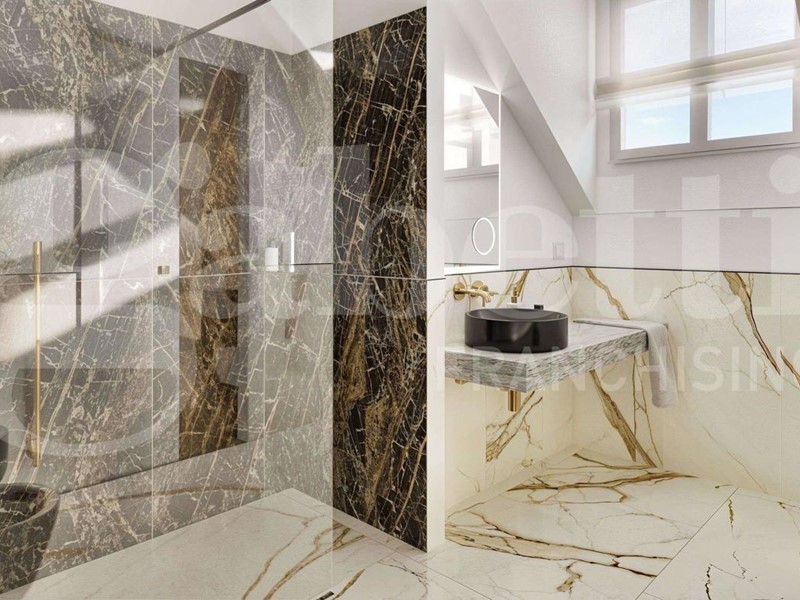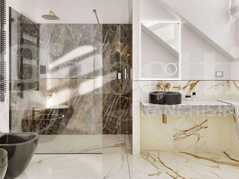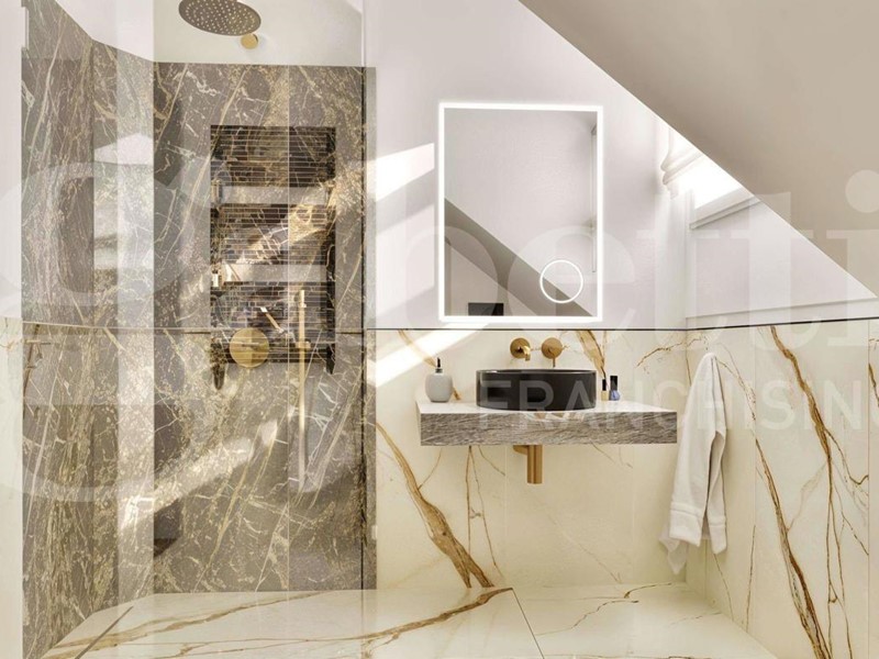 ? 2 bagni moderni, di cui uno principale con doccia walk-in di grande impatto scenico.