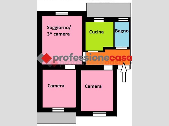 L'appartamento, con i suoi 85mq circa, è luminoso ed arioso grazie alla doppia esposizione parallela sud - nord ed è composto da ingresso tradizionale, soggiorno (attuale terza camera), cucina con balcone verandato, 2 camere di cui una con balcone e bagno finestrato con doccia.