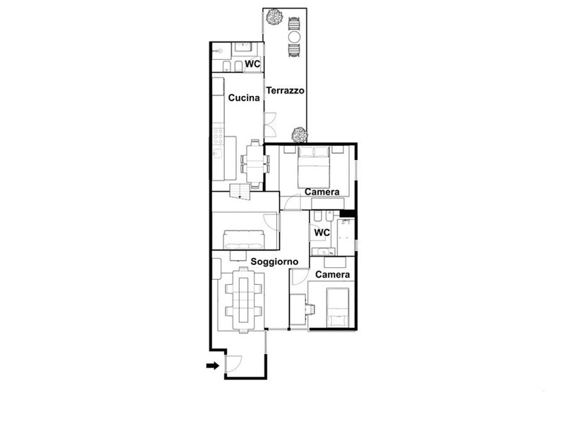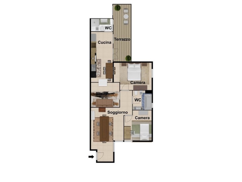 L'immobile si presenta con una distribuzione interna funzionale: l'ingresso conduce al soggiorno, la cucina è separata e abitabile che conduce al terrazzo a livello, la zona notte è composta da due camere da letto e due bagni. Gli ambienti risultano ben organizzati e consentono diverse possibilità di personalizzazione.