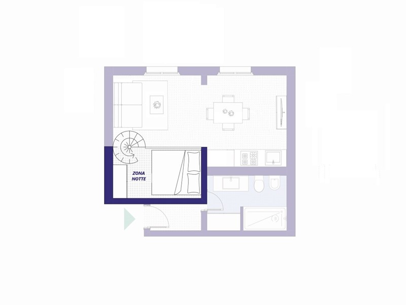 ingresso, monolocale con angolo cottura leggermente separato, soppalco per zona notte, bagno.