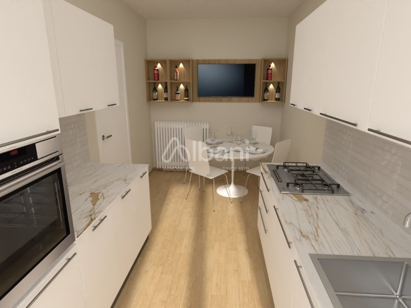 L’unità è attualmente composta da: Cucina, Zona pranzo con balconi, Bagno di servizio, Due camere matrimoniali (ognuna utilizzabile anche come camera con 2 posti letto), Una camera singola