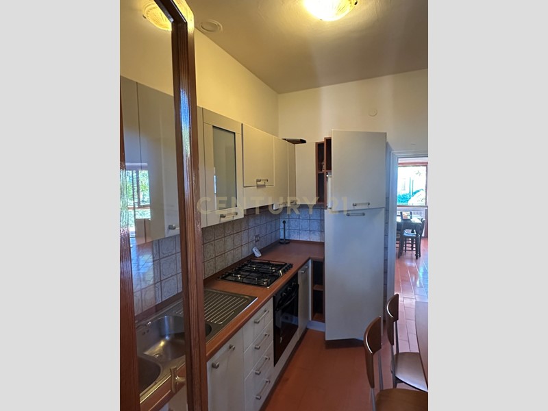 Adiacente al soggiorno troviamo la cucina, dotata di una seconda terrazza che affaccia direttamente sul giardino privato, offrendo un piacevole sfogo esterno e una vista verde e rilassante.