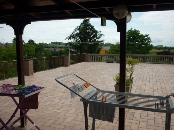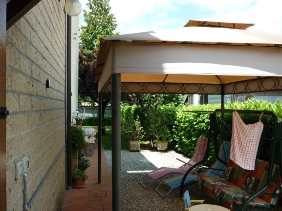 piena proprietà di un edificio costituito da un fabbricato ad uso abitazione composto da ingresso, soggiorno, due bagni, cucina, studio, disimpegni, ripostiglio, due locali pluriuso con tre ripostigli e portico esterno al piano terreno, tre camere, due bagni e ampia terrazza al piano primo con una tettoia con berceau (piani tra loro collegati da scala interna) oltre a resede nel quale è realizzato un manufatto in legno; magazzino in parte soppalcato.