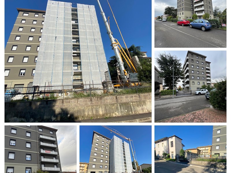 Appartamento di superficie lorda di circa mq 109, posto al 5°piano di un edificio condominiale denominato "Grattacielo", composto da un ingresso posto a sinistra di chi sale le scale condominiali, soggiorno, cucina, due camere, bagno, disimpegno, ripostiglio e terrazzo. Le finiture sono in gran parte dell'epoca di costruzione, come buona parte degli impianti, ma l'appartamento risulta visivamente abitabile. Il Garage di superficie lorda di circa mq 23, posto al piano terra, risulta accessibile dal resede condominiale e collegato direttamente con l'androne condominiale. Le unità immobiliari sopra descritte sono comprensive delle parti condominiali e per precisione il resede, il vano caldaia, il vano scale ed il vano ascensore condominiale.
